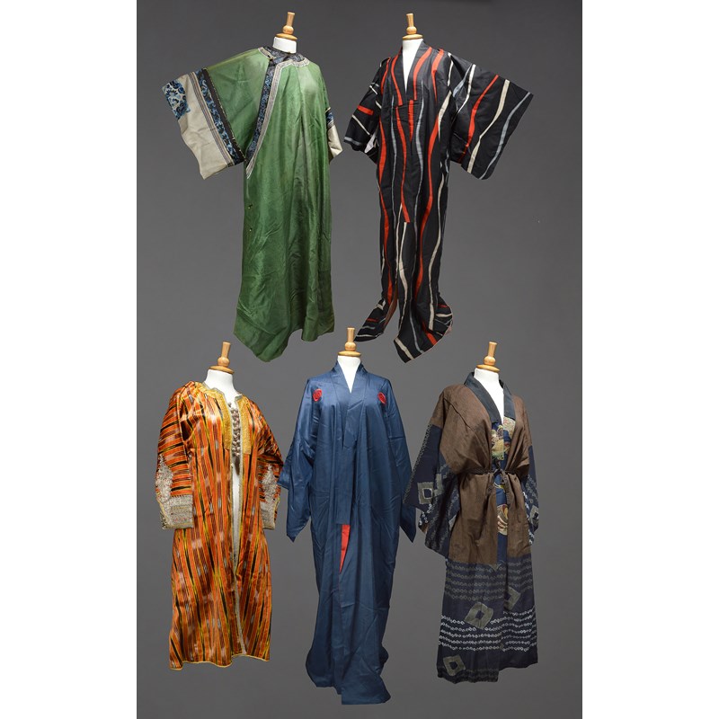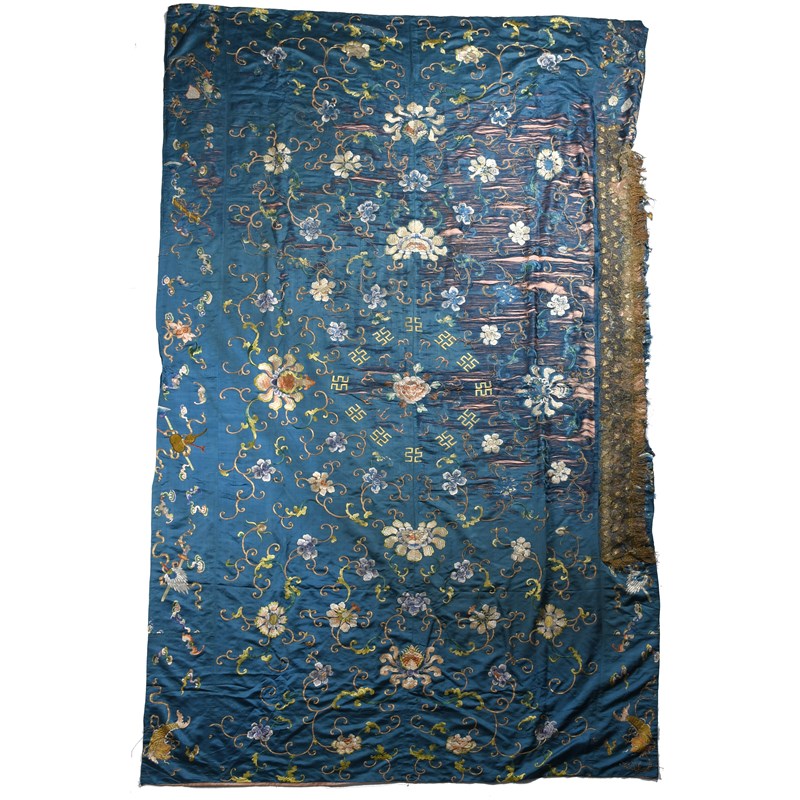 with metal thread and glass beads 112cm high, a Chinese green silk robe with embroidered sleeves and collar and with chased gilt metal buttons, a Japanese blue and red silk kimono, a silk Haori jacket c. 1960s - 1970s and a Japanese part silk coat. Together with a Chinese embroidered silk bed cover,