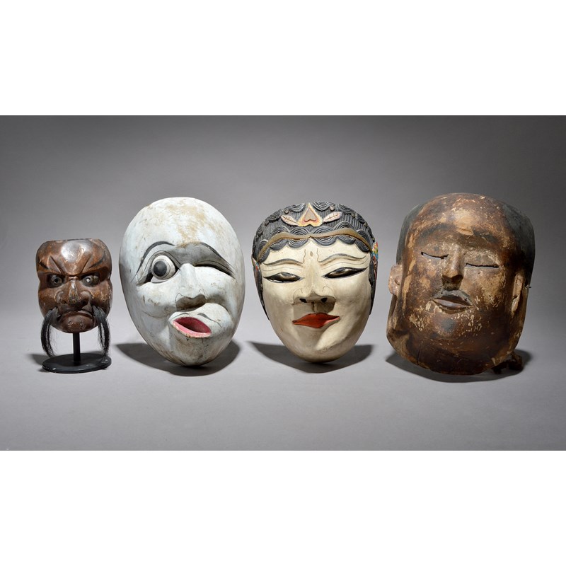a Japanese miniature noh mask, with a horse hair moustache, 11cm high, on a stand, and a Japanese mask, with painted decoration, 22.6cm high. (5)