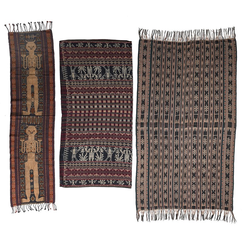 woven with two standing ancestor figures 190cm x 86.5cm, with a Flores ikat sarong with four bands of standing figures and animals 146cm x 64.5cm, and a Sabu ikat of two strips of stylised figures and animals 185cm x 39cm. (3)