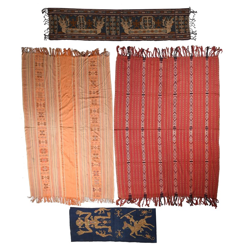 and two Timor Island cloth panels, one red and pink 211cm x 132cm, the other pale orange and sand coloured with woven stars and figures, 211cm x 112cm. (4)