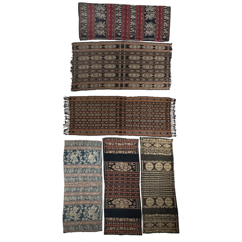 one decorated foliage and birds 162cm x 56cm, another with text 'DUARERANG' 165cm x 58cm, together with two Sabu ikats with geometric and linear designs, 182cm x 76cm, 167.5cm x 75cm. (6)