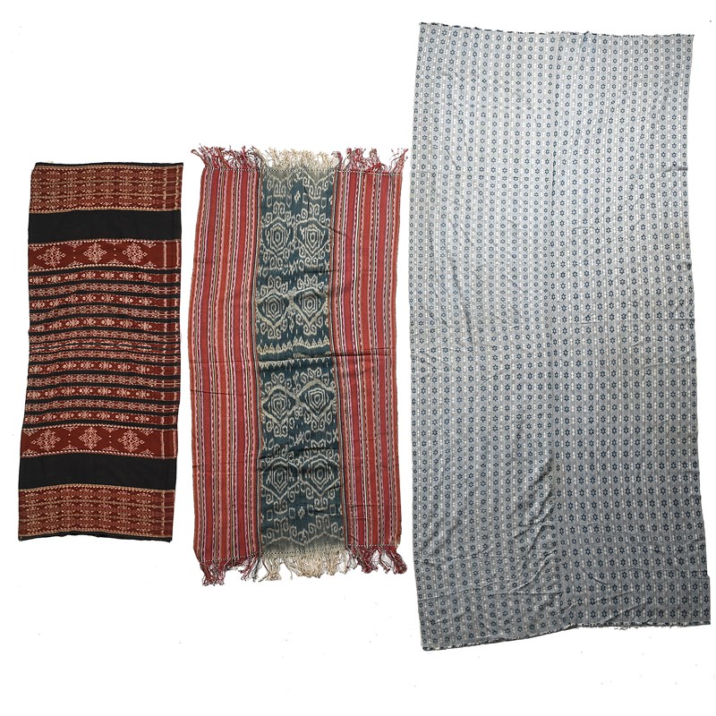 one decorated with stars on a blue and white ground, 246cm x 102cm, the other with red and pink stripes and a stylised geometric design, 171cm x 75cm, together with a Sabu ikat sarong, 151cm x 55cm. (3)