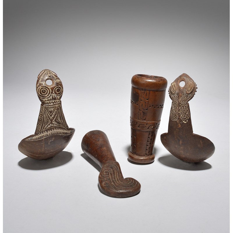 and two Papua New Guinea spoons, coconut shell with carved zoomorphic handles with lime fill, 13cm and 14.2cm long. (4)