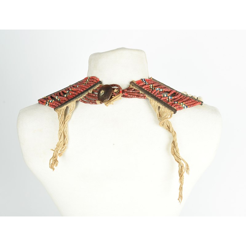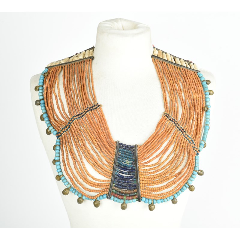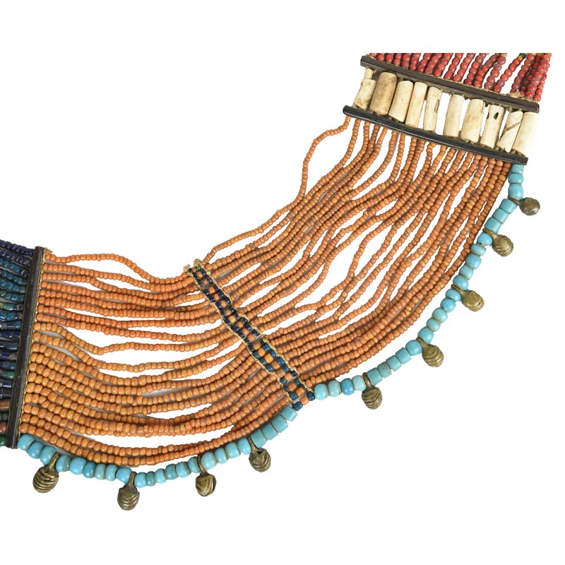 coloured glass beads, shell beads, horn spacers, fibre and ribbed brass bell pendants, with a horn clasp,
