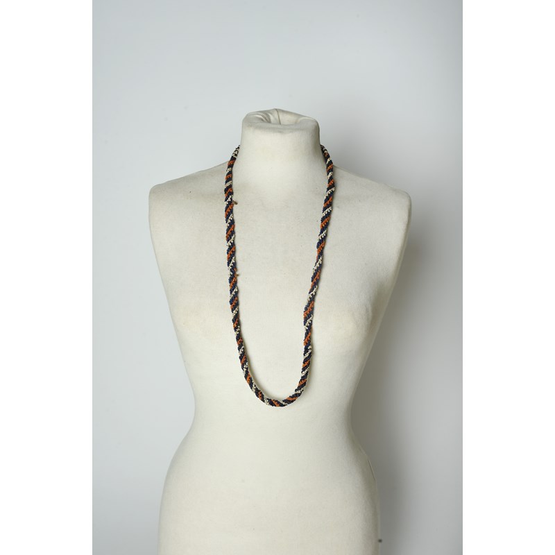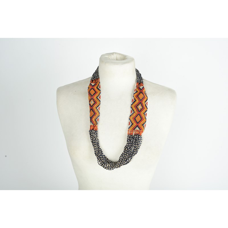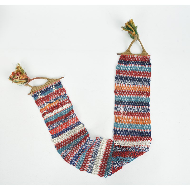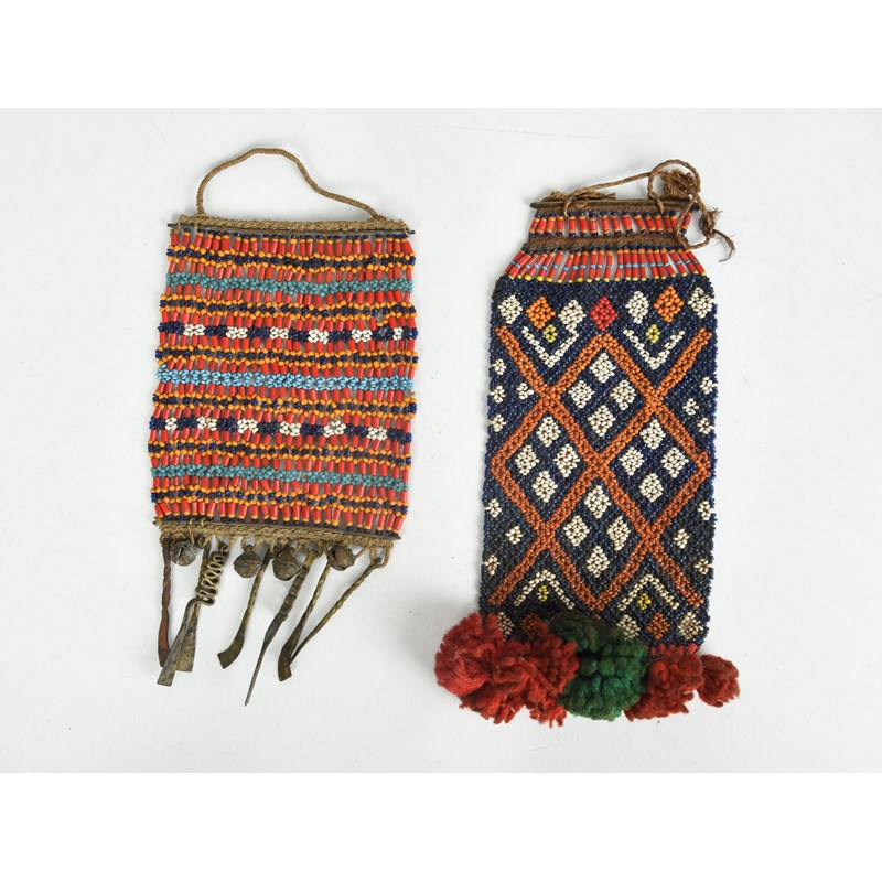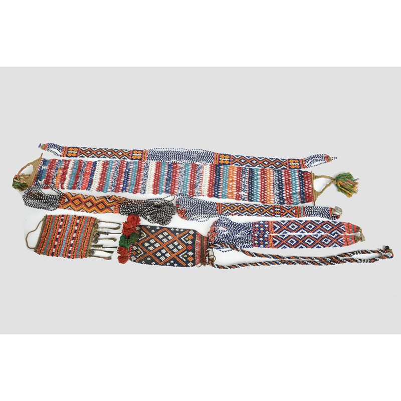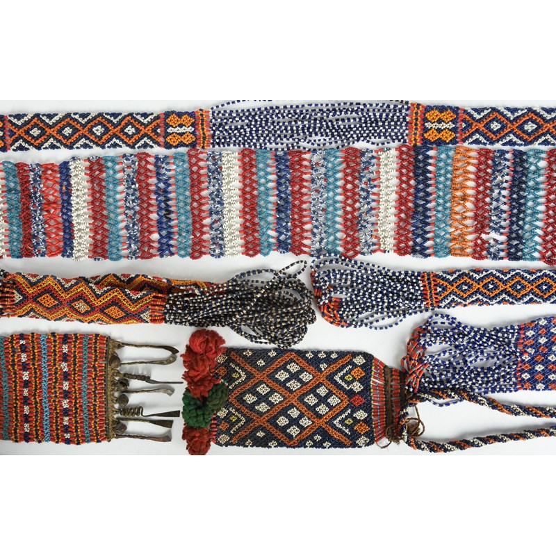 a Naga three coloured bead necklace, with a button fastener, 92cm long, two Naga beaded panels, one hung with brass implements and bells and the other with coloured wool pompoms, 19.5cm and 20.5cm long, and a Naga beaded belt, 95cm long. (8)