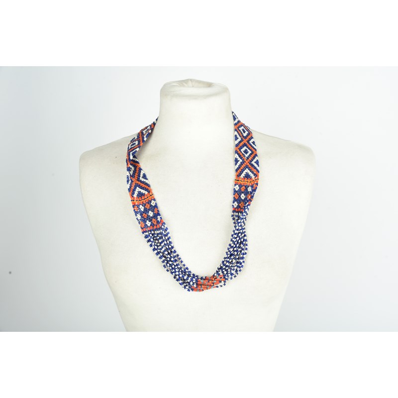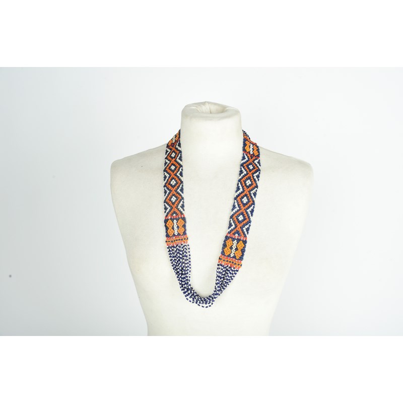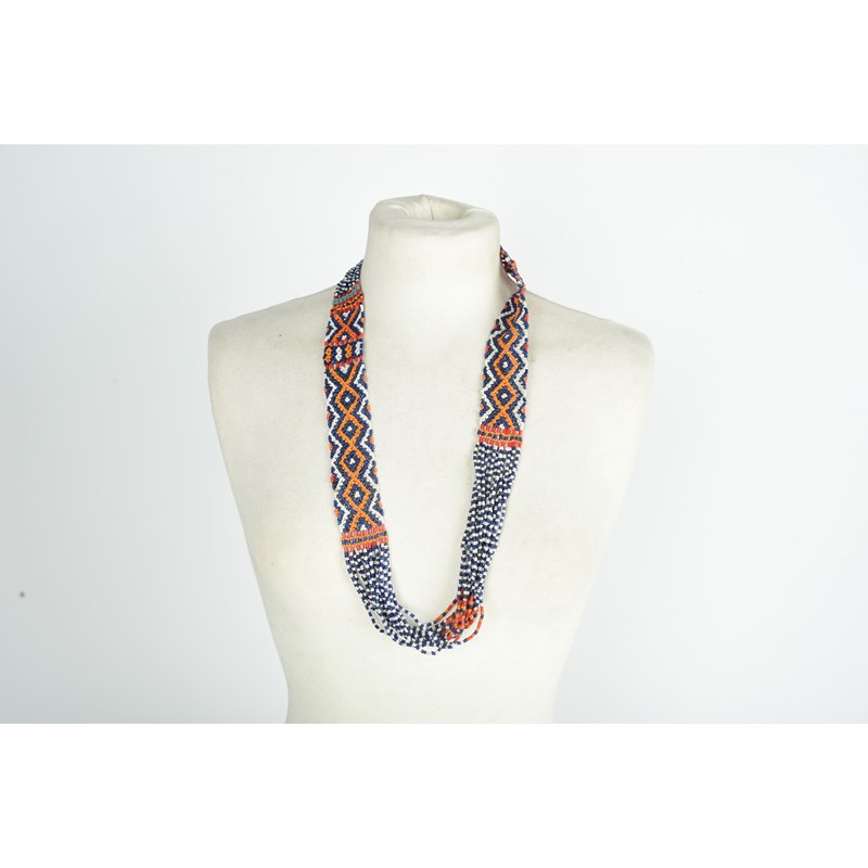 coloured glass beads and fibre, with multi strands and geometric panels, three with coin fasteners and one with a button,
