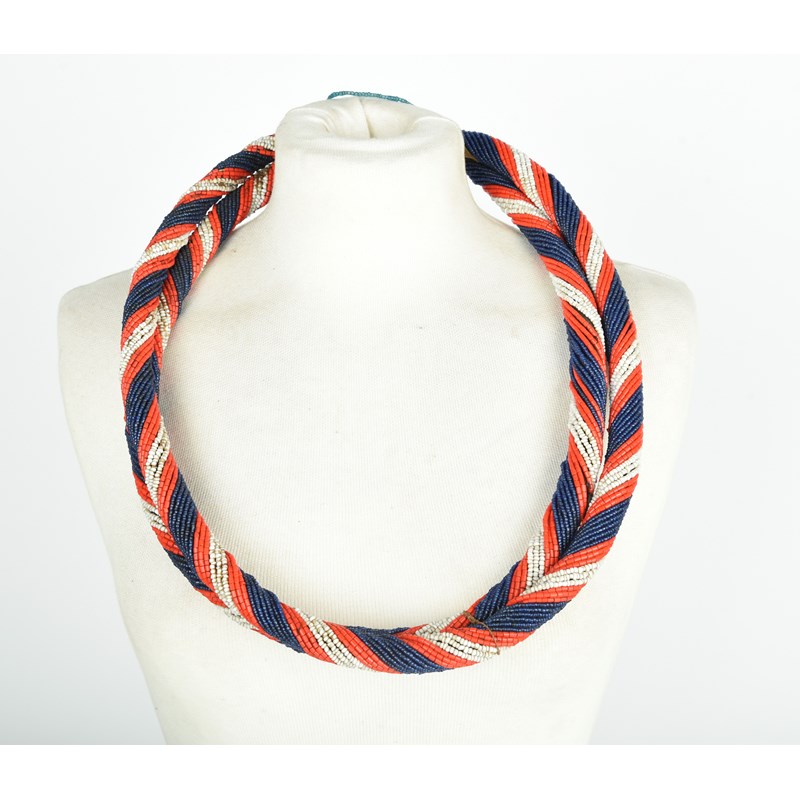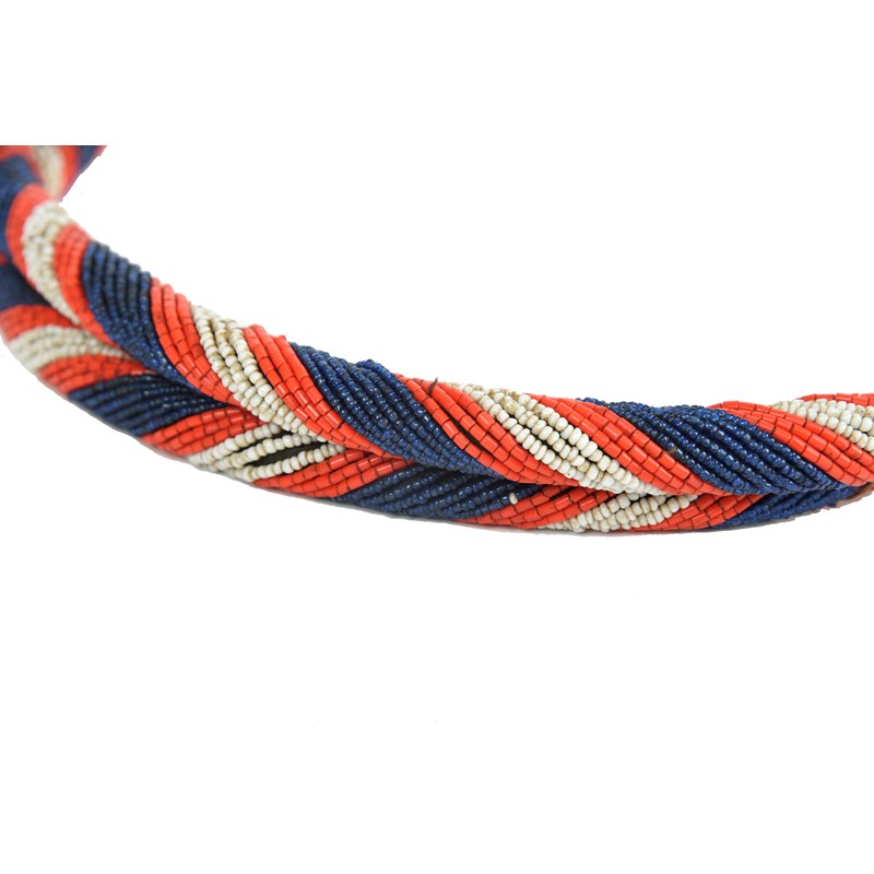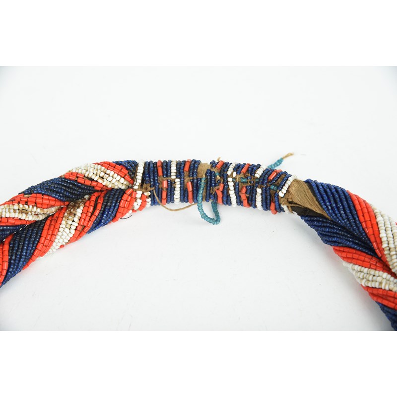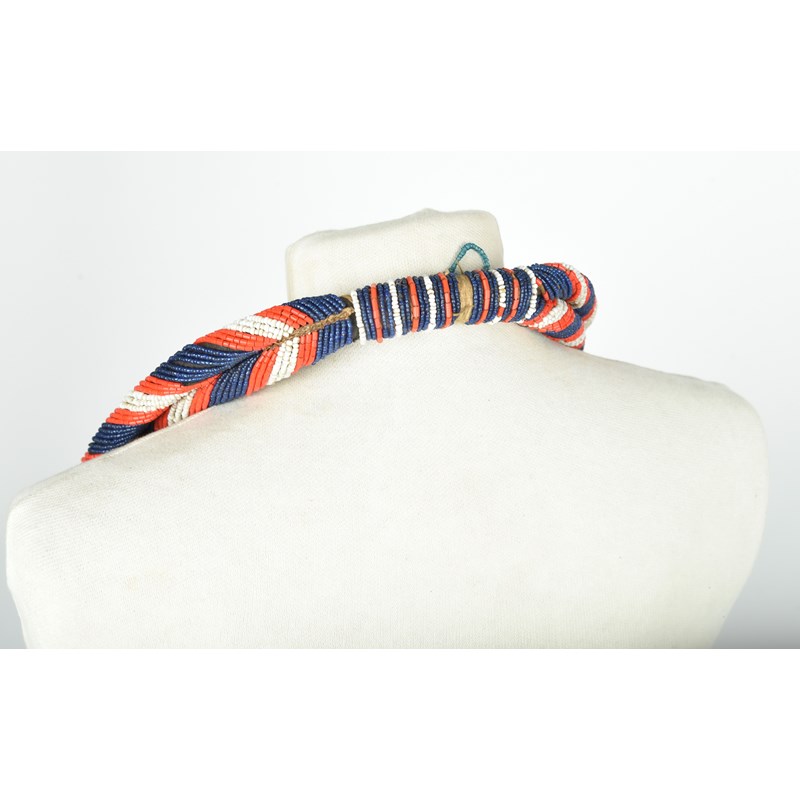 white, red, blue and teal glass beads, cloth and fibre,