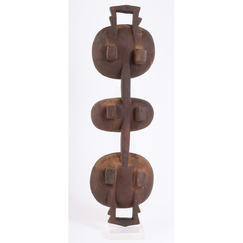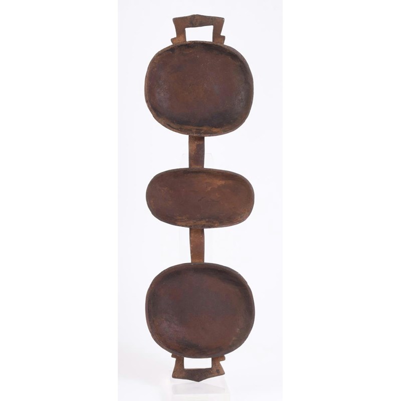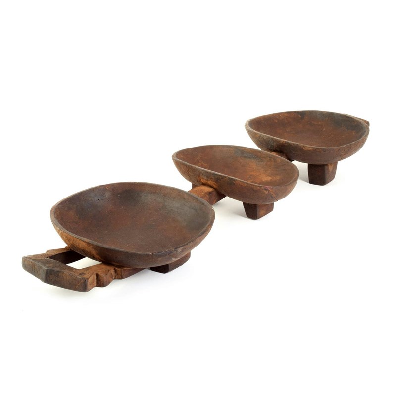 A rare Zulu platter, with three bowls, the underside with relief decoration, with open handles and lug feet, 63cm long.