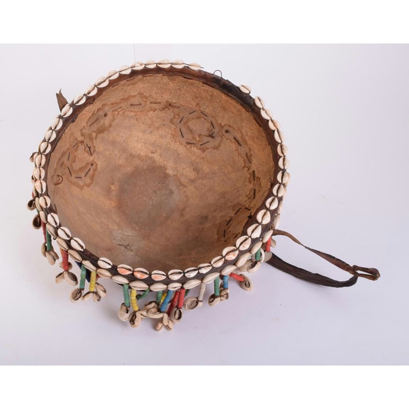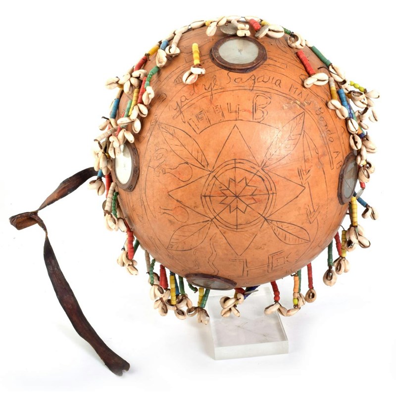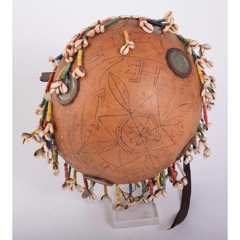 A Mali calabash, the U shaped gourd body decorated leaves, figures, fish, birds, a donkey inscribed 'Yadiye sagara Mali Bondo AB, 1994B', with inset mirror panels, with shells and beads and leather strap, 38cm diameter.