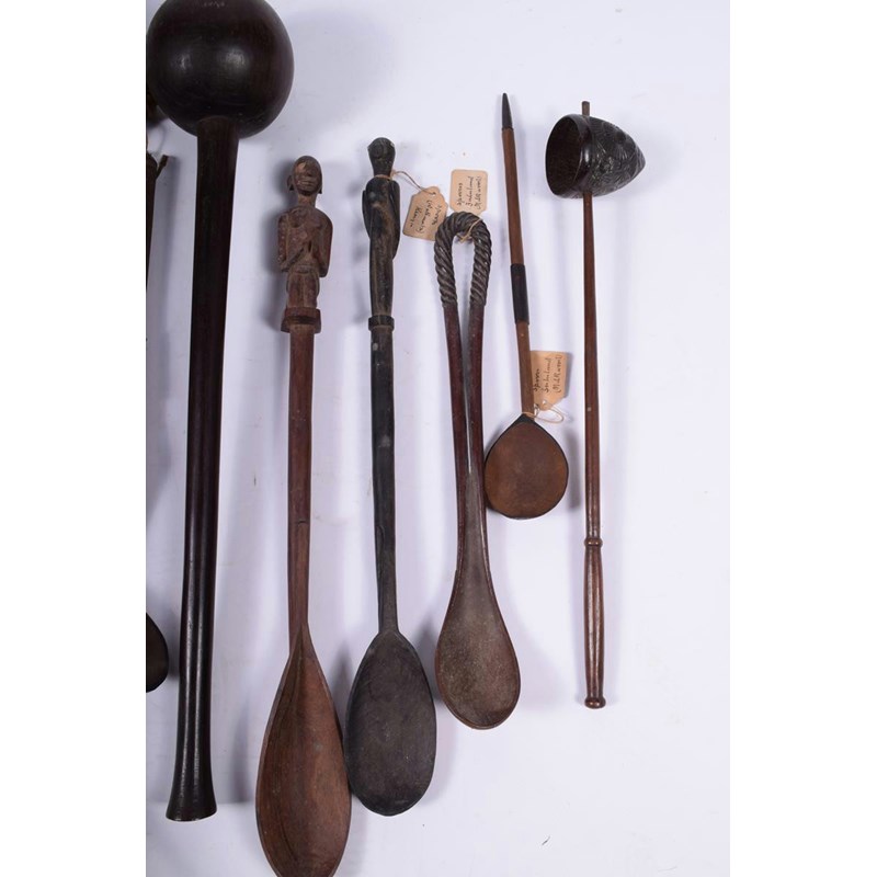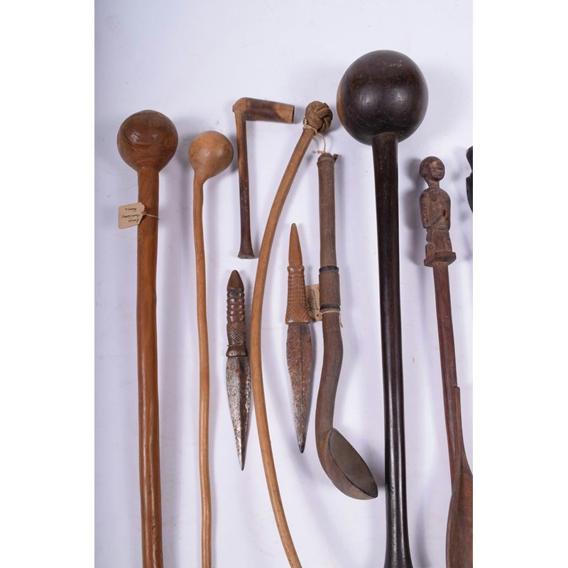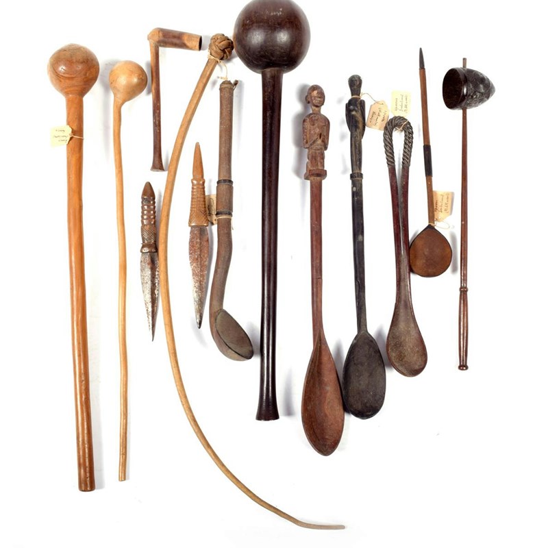 A South African knobkerrie, 53.5cm, three Zulu spoons, a Kenyan spoon with bird finial, another with kneeling female figure, a ladle with carved nut bowl, two clubs, a South African pipe, a bone stick with knot handle and two wood handled knives. (13)