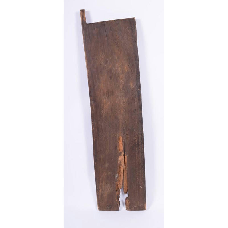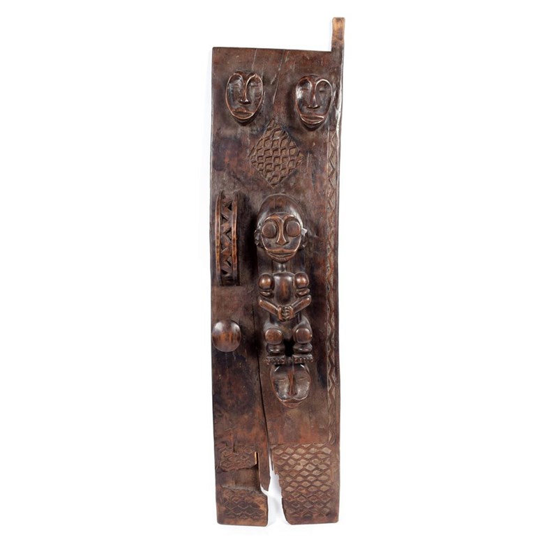 A Fang style carved door, with central figure and masks, with handle, 118.5cm high.