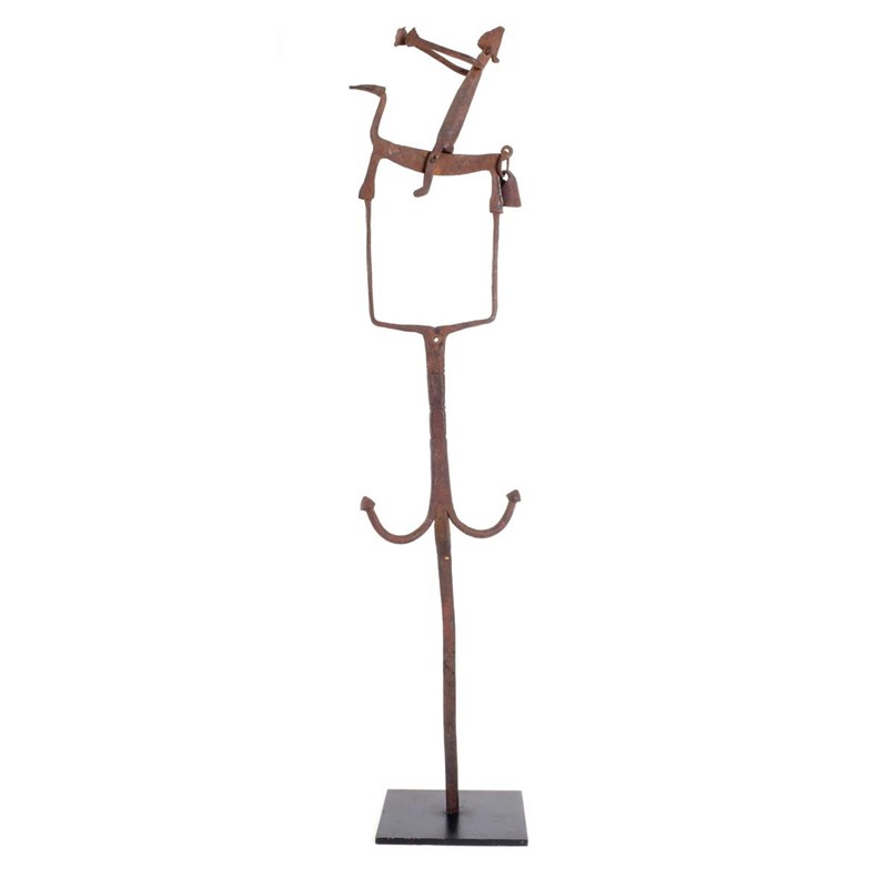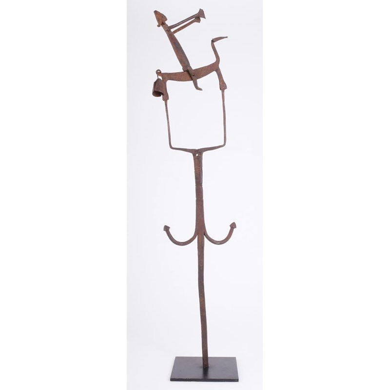 A Bambara iron staff, with an equestrian pivoting figure and bell, 82cm high, on a later stand. (2)