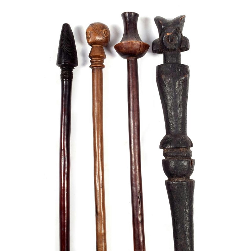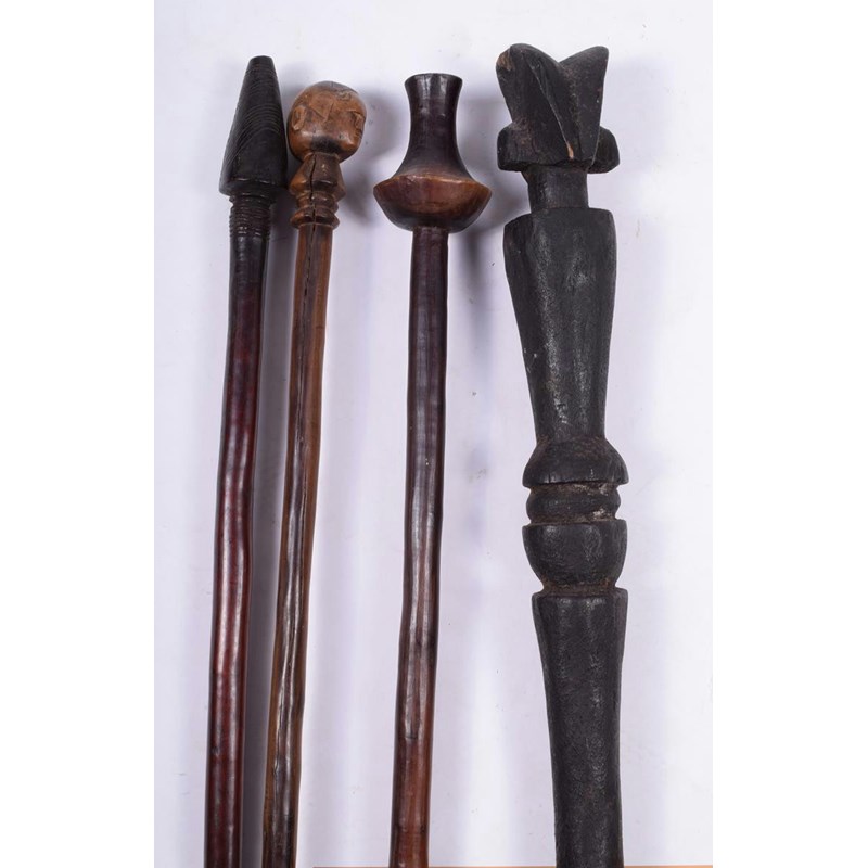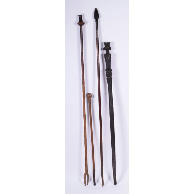 A Kwere staff, Tanzania, with female figure terminal, 141cm long, a staff with urn shaped finial and bificated base, 165.5cm long, a staff with incised conical finial and a staff with head terminal, 94cm long. (4)