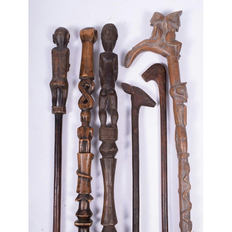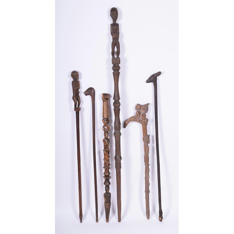 A Bambara staff, with animal head finial, 111cm long, an African staff with standing figure terminal, a staff with stylized head terminal, a staff with figures, snake and clenched fist, a staff with figures and snakes and a staff with a standing male figure, 155cm long. (6)