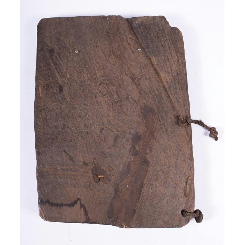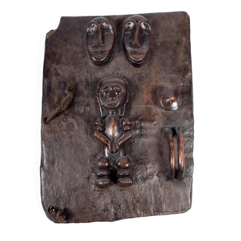 A Fang style carved grain door, with a central standing figure and two masks, with handle, 62.5cm high.