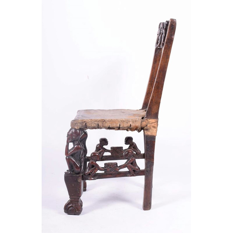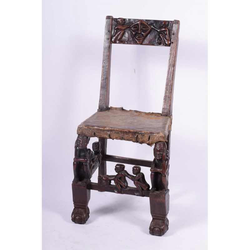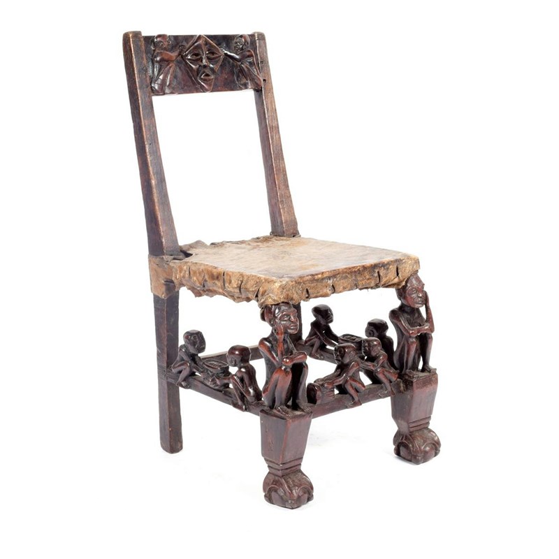 A Chokwe chair, with carved top rail, figural supports and stretchers with a hide covered seat, 70.5cm high.