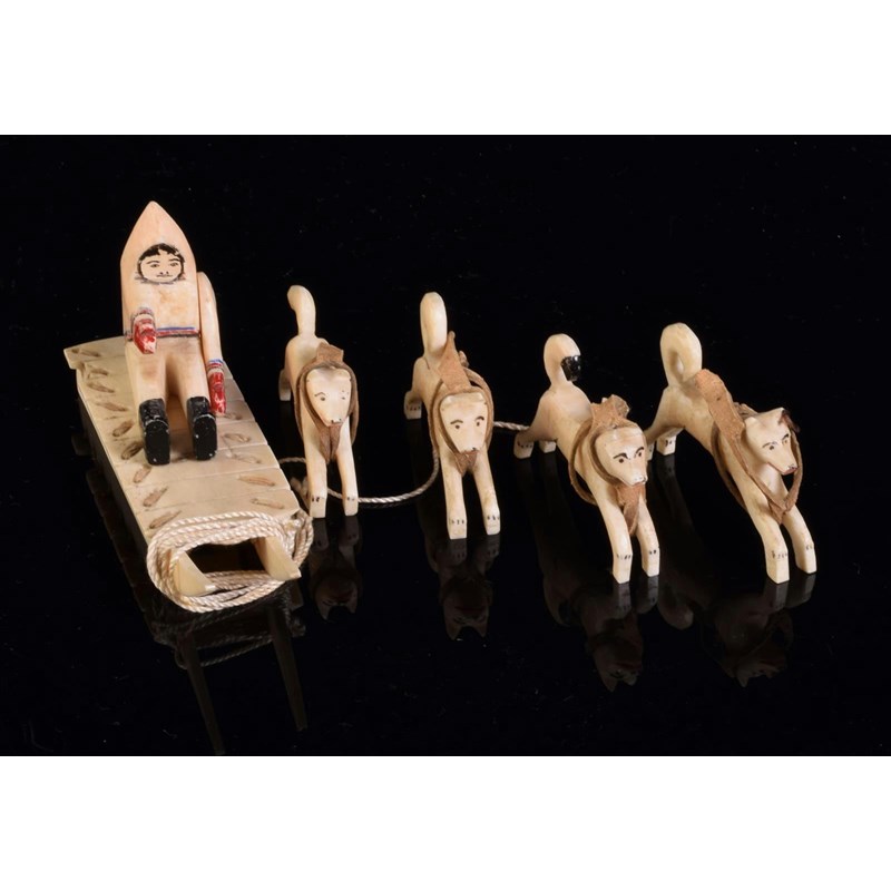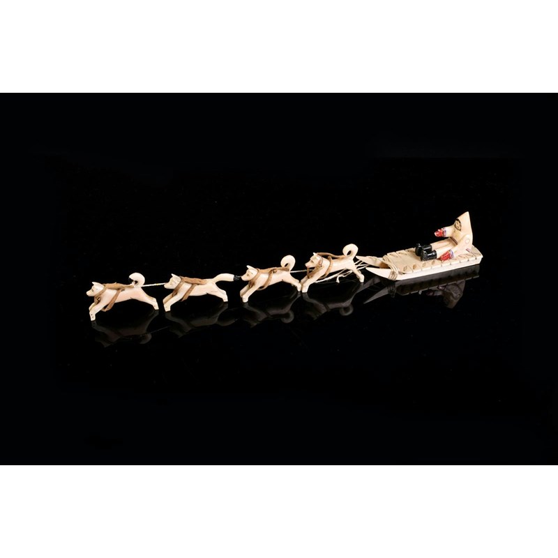 An Inuit carved bone sleigh group, with a seated figure with an articulated left arm, being lead by a four dog team, 5cm high.