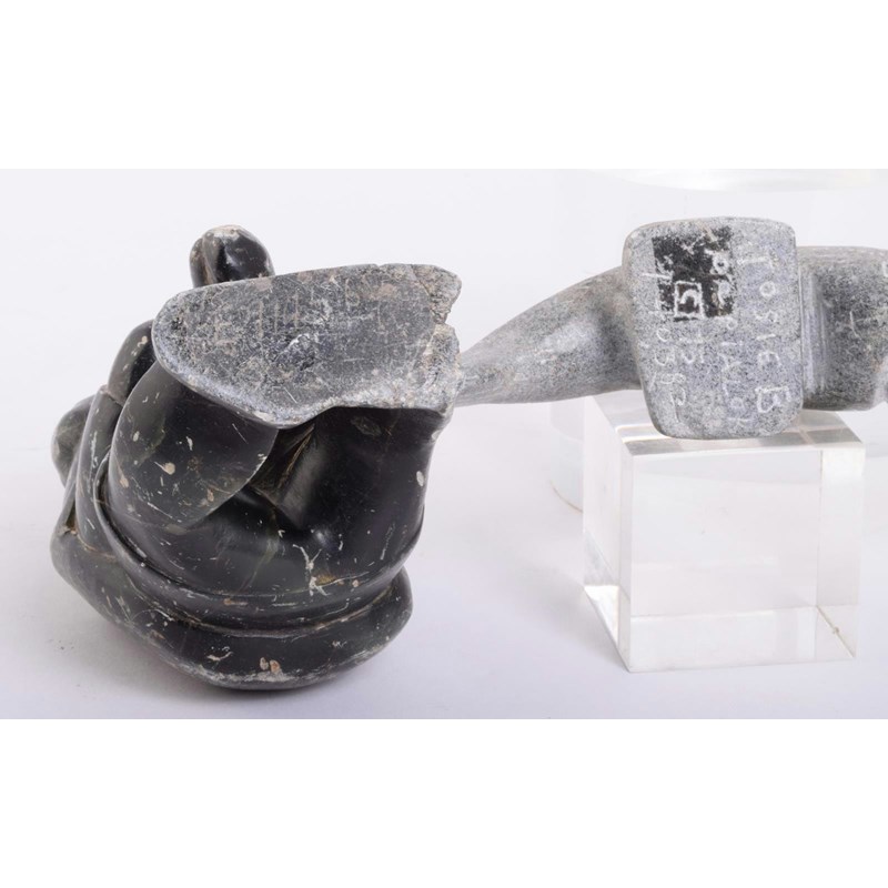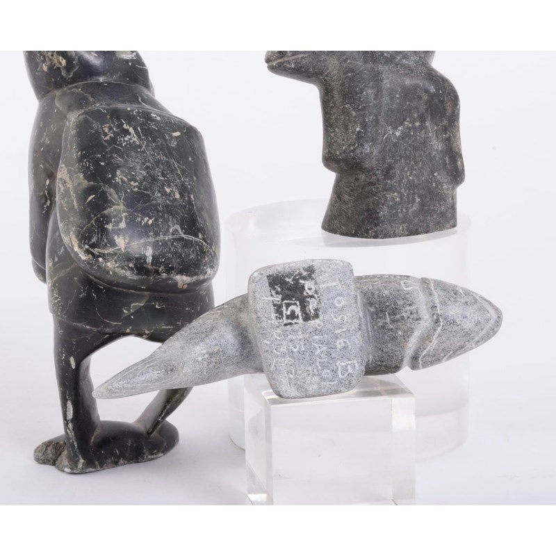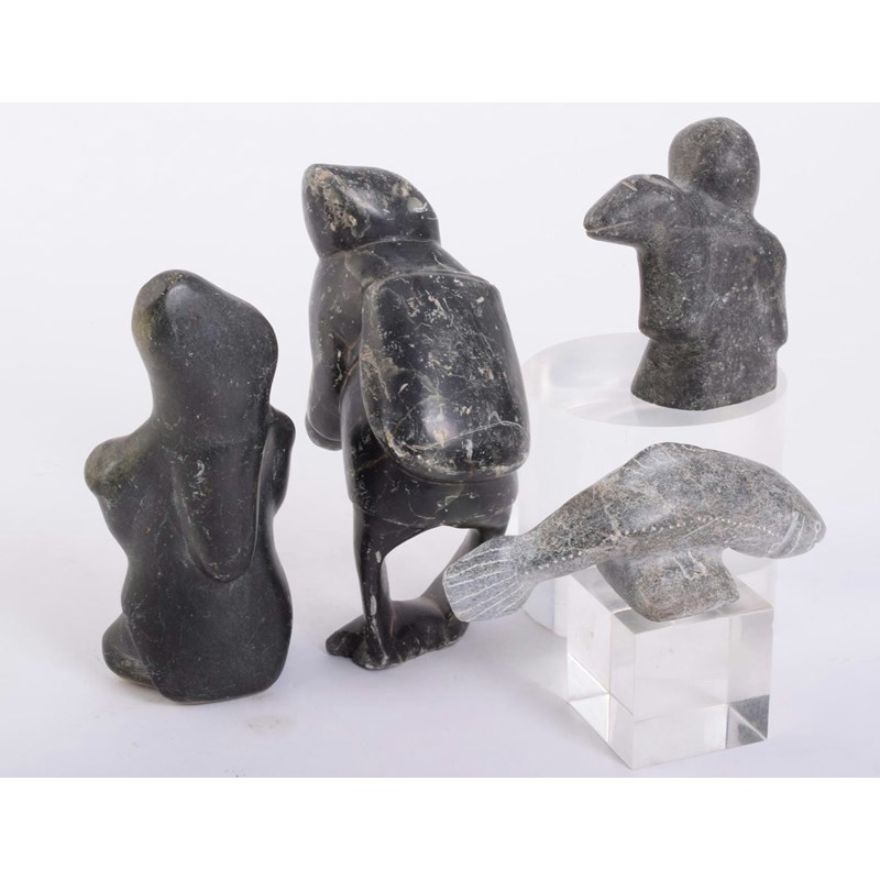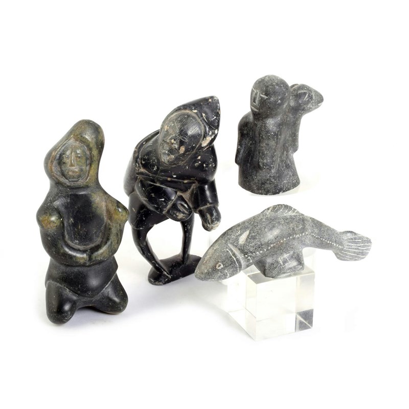An Inuit carved greenstone fisherman, the underside faintly inscribed, 17.5cm high, an Inuit carved greenstone kneeling figure, the base inscribed, 16.5cm high, an Inuit carved stone figure and seal, 10cm long and an Inuit carved stone fish, the underside inscirbed 'Josie B Papialok C75, 140382', 14.5cm long, Inuit Women Artists edited by Odette Leroux, Marion E Jackson and Minnie Aodla Freeman, 1996 and Inuit Art in the 1970s, 1979. (6)