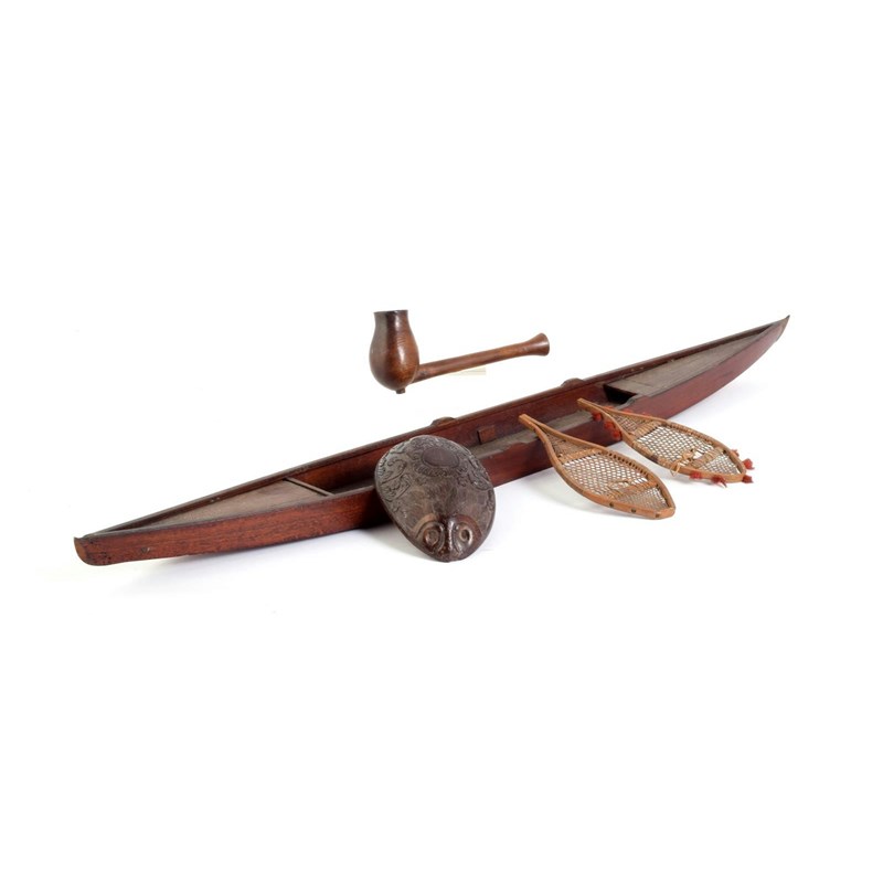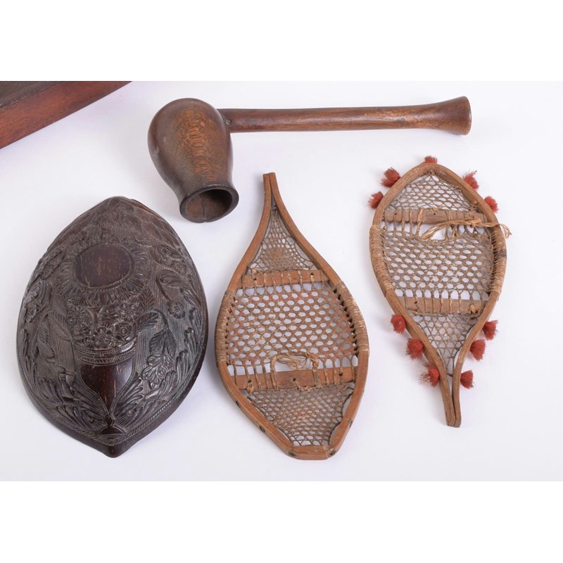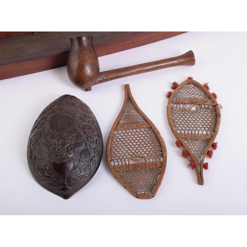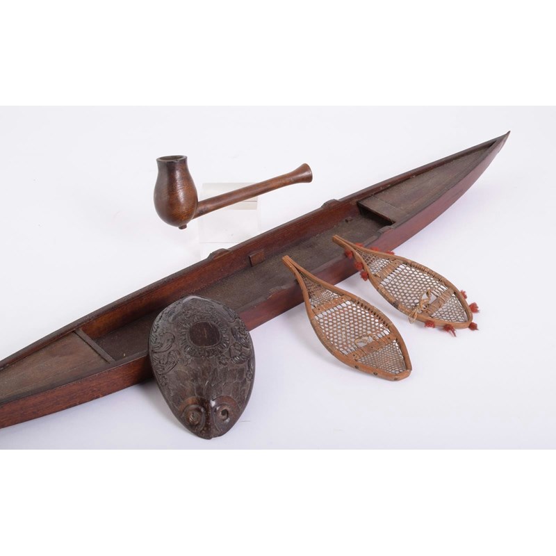 A stained wood model canoe, 65.5cm long, two miniature snow shoes, one with red tassels, 14.6cm and 14cm long, a South African wood pipe, 14.5cm long, a carved coconut shell, with bear mask and flowers in a vase, 13cm long. (5)