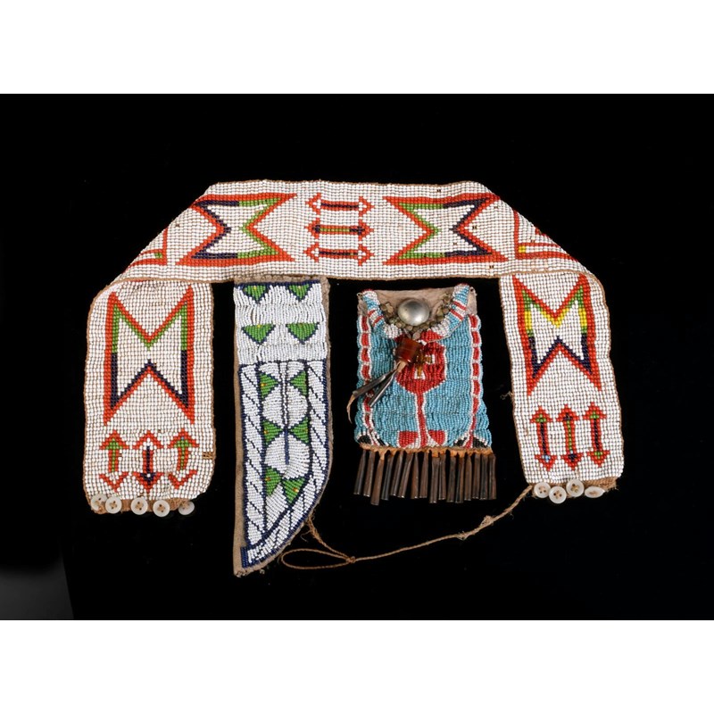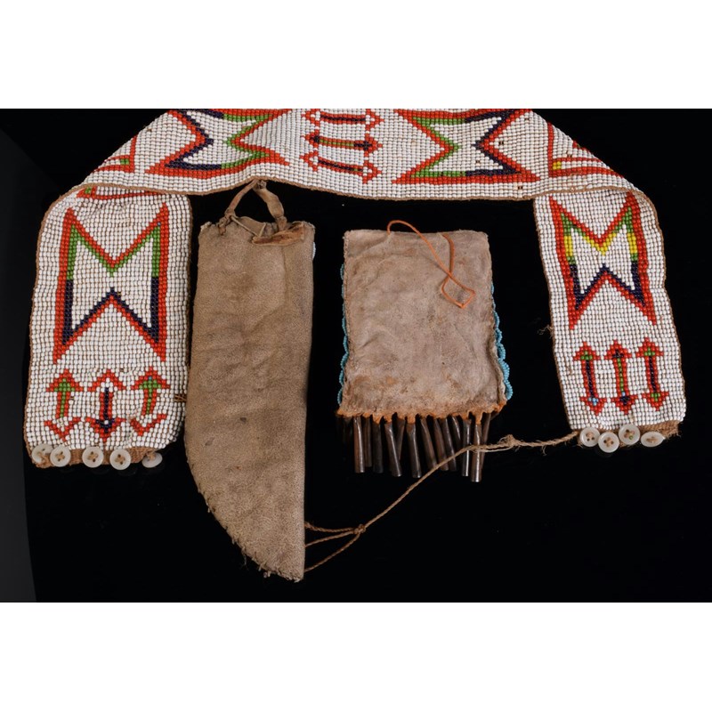 A Native American beadwork purse, with metal tassels and boss decorated a five-pointed star and with a yellow heart bead, 15cm high, a leather and beadwork knife scabbard, 21.5cm long, and a beadwork belt with buttons, 71cm long. (3)