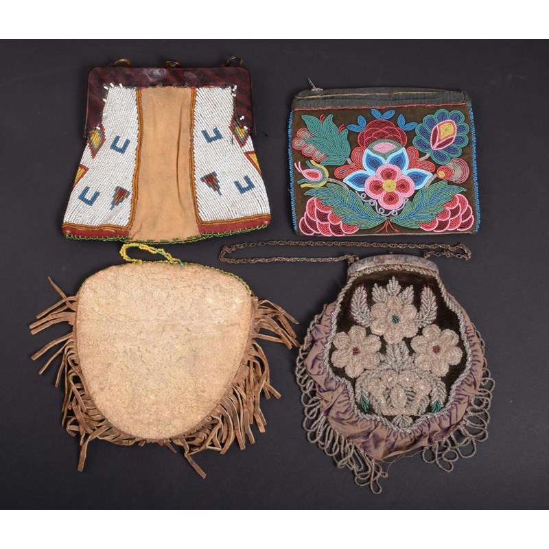 A North American Indian beadwork bag, with mainly clear glass flowers and a steel frame with chain, 16.5cm wide, a U shaped bag, a beadwork bag with zip and a white ground beadwork bag with French faux tortoiseshell mount. (4)