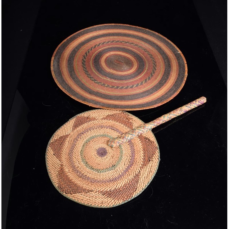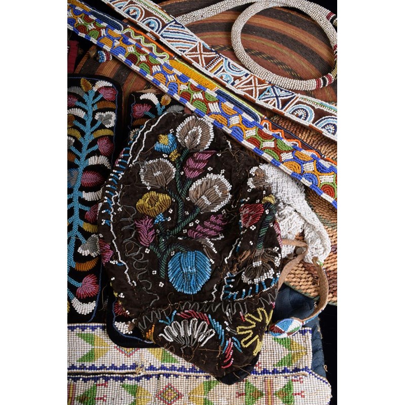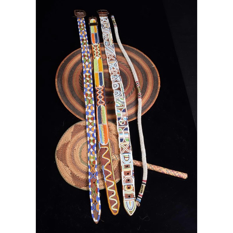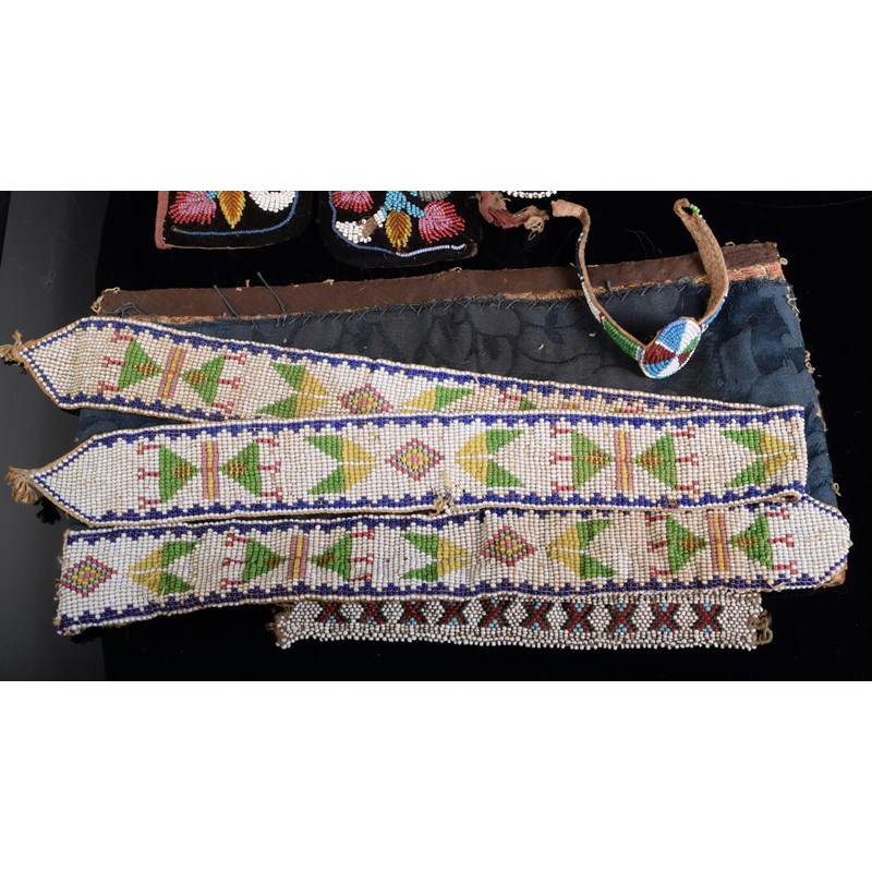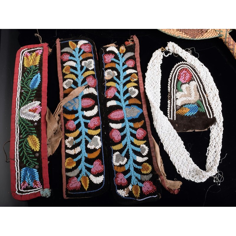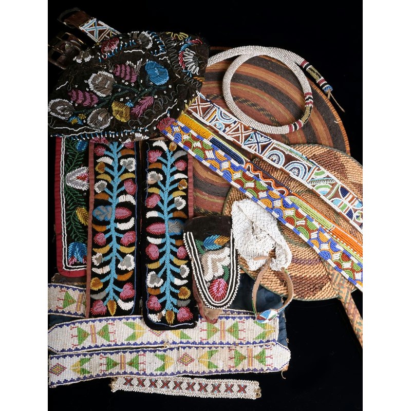 A collection of North American Indian beadwork, to include a Glengarry type hat, three leather backed belts, a bookmark and four panels, necklaces, a woven circular mat and a face fan. (15)
