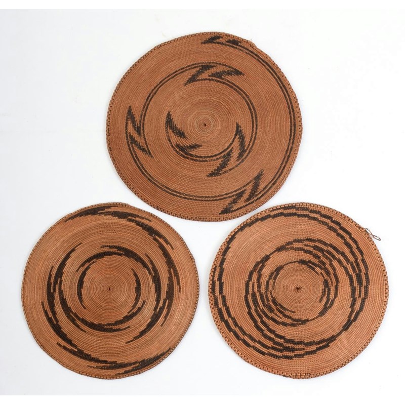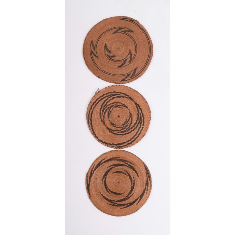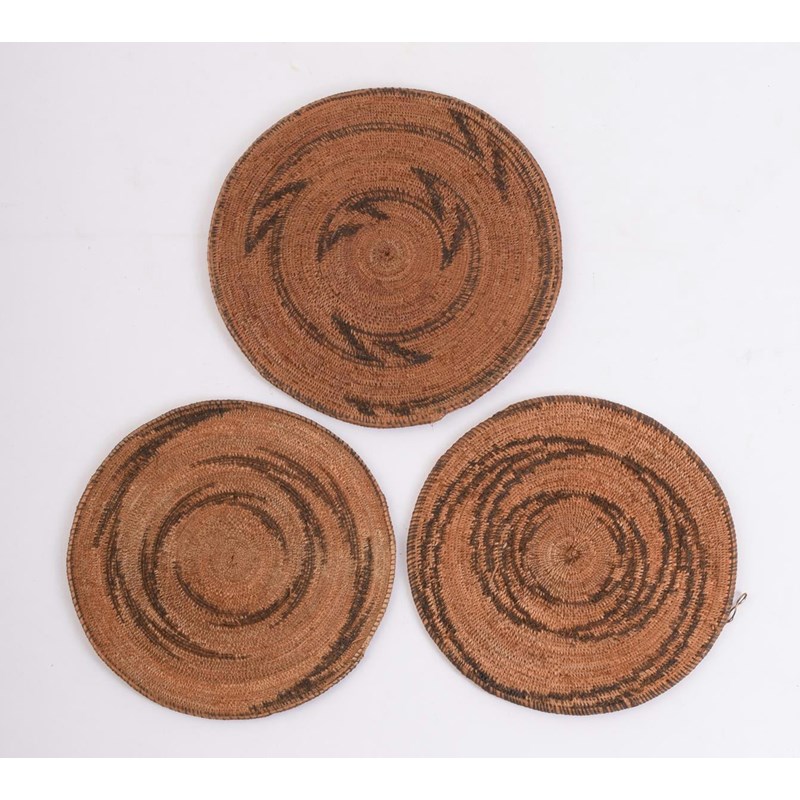 Three Tutsi woven grass presentation trays, with spiral designs, 11.9cm (2) and 13.2cm diameter. (3)