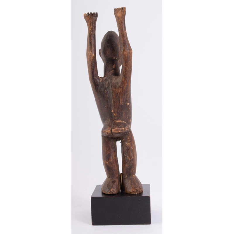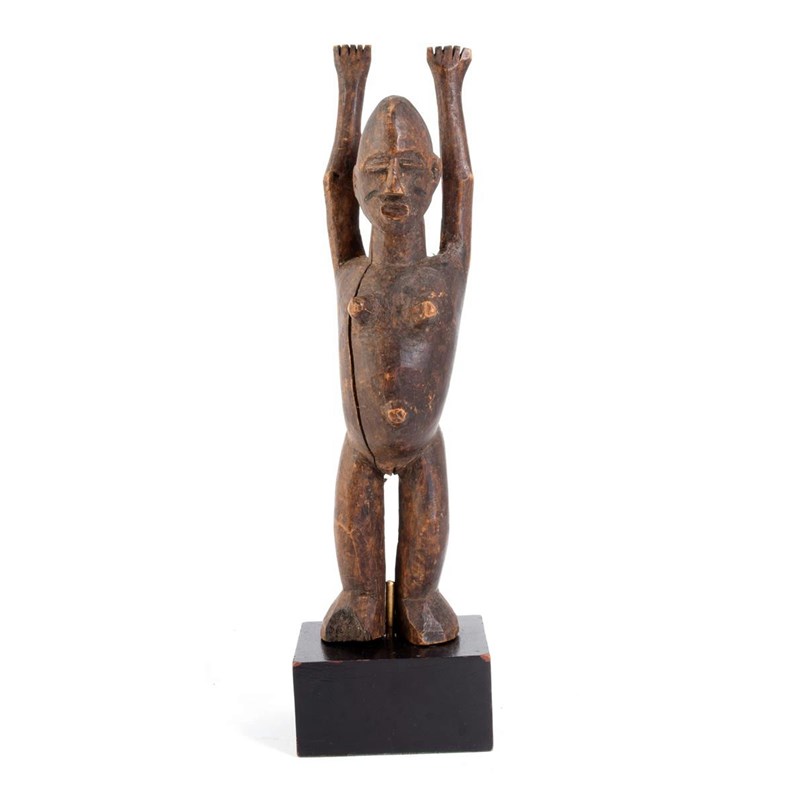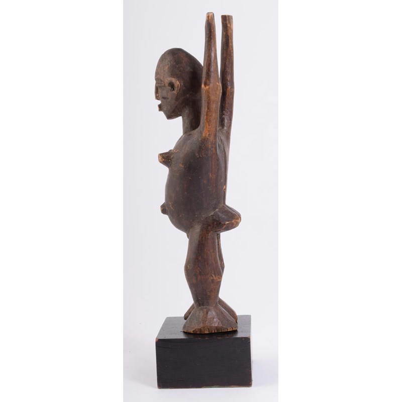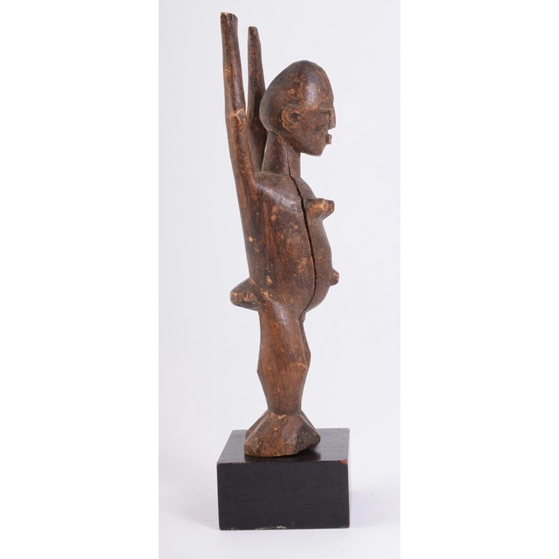 A Lobi standing female figure, with out stretched arms, 31cm high, with stand. (2)