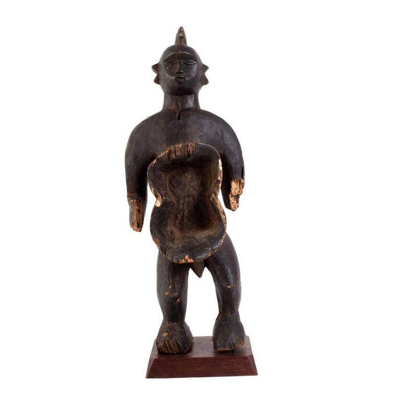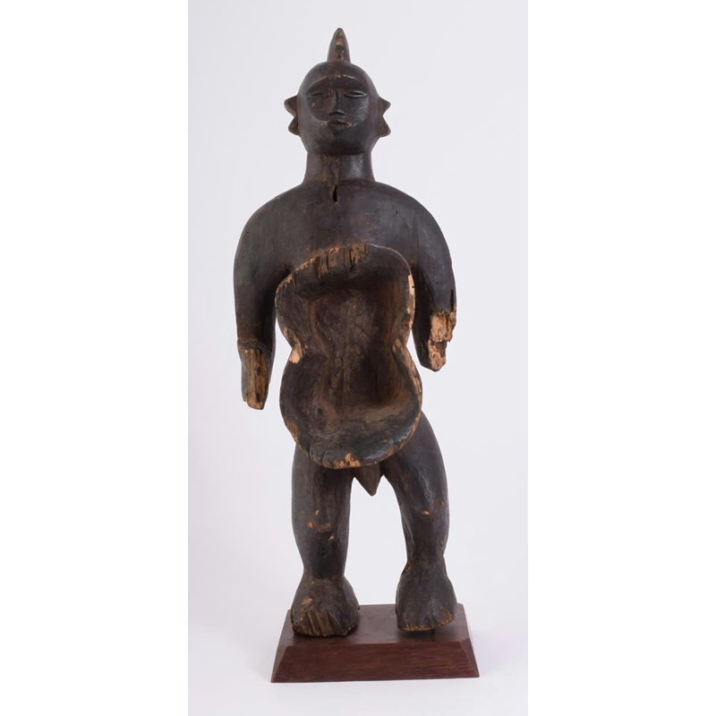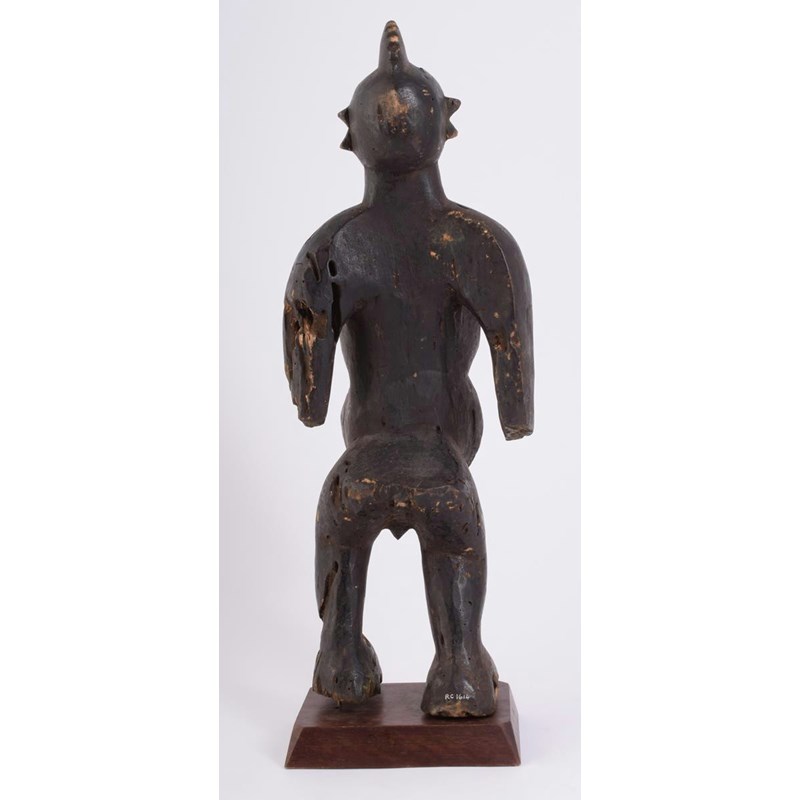 A West African standing male figure, with a single cresting and a shaped abdomen bowl, with inventory number 'RC 1614,' 54.5cm high, on a base. (2)
