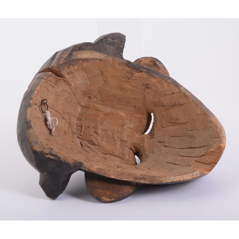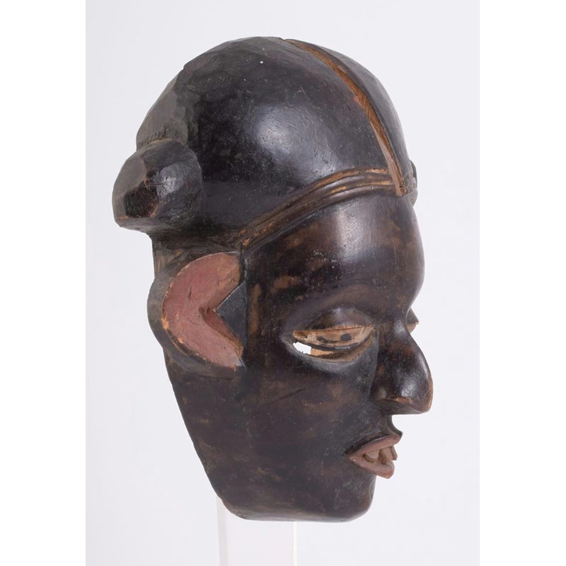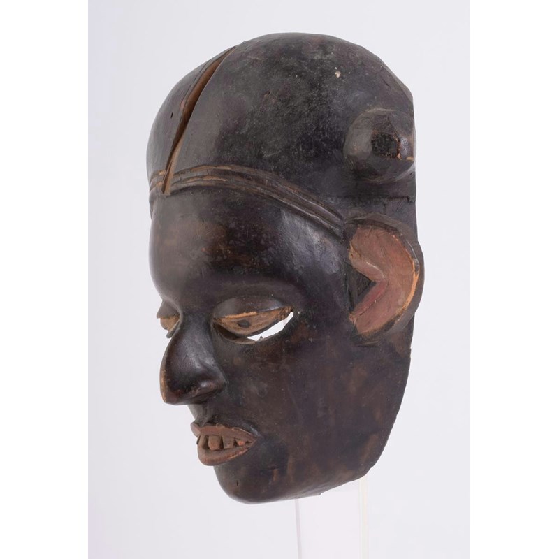 A Nigerian carved mask, with filed teeth and polychrome decoration, 24.5cm high.