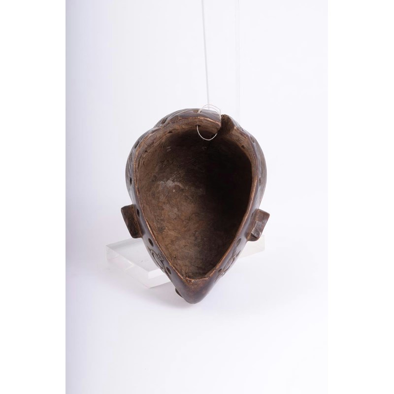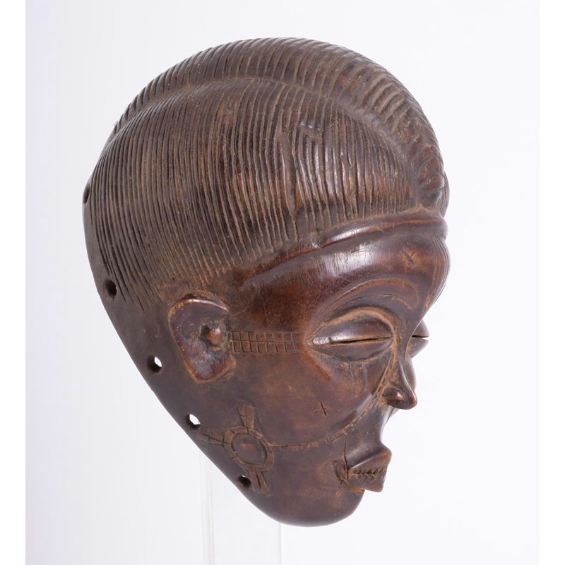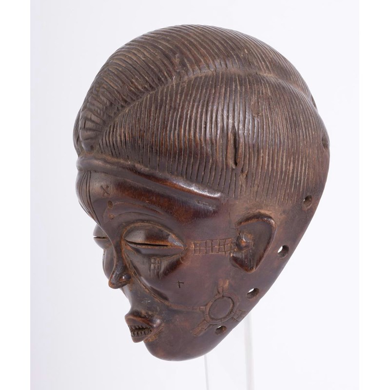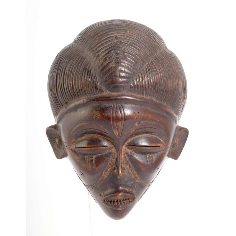 A Chokwe mask, with ribbed coiffure, scarifications and filed teeth, 21cm high.