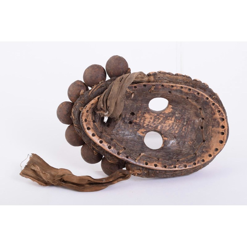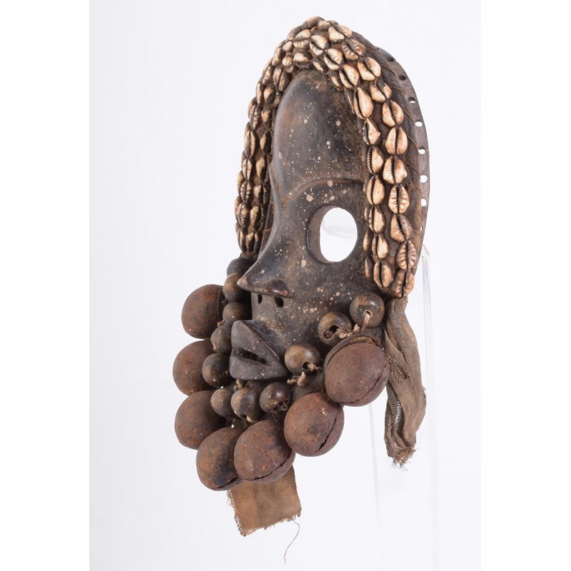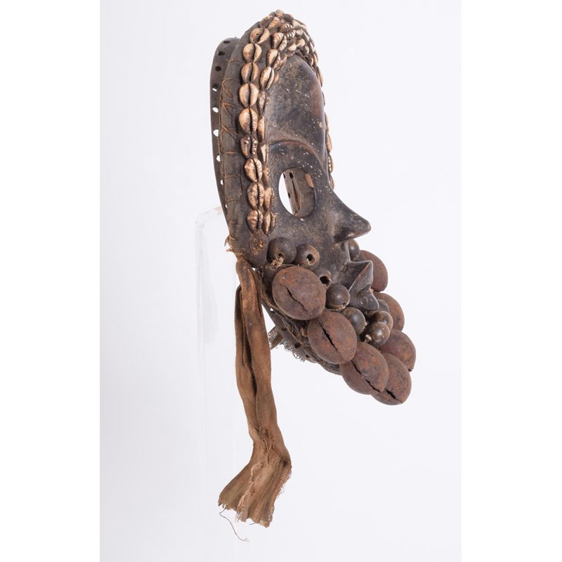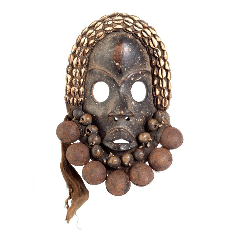 A Dan mask, with applied cowrie shells, seeds and bells, 27cm high.