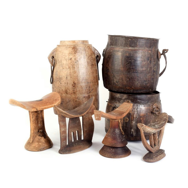 Four East African headrests, and three wood containers with iron handles, the highest 32cm high. (7)