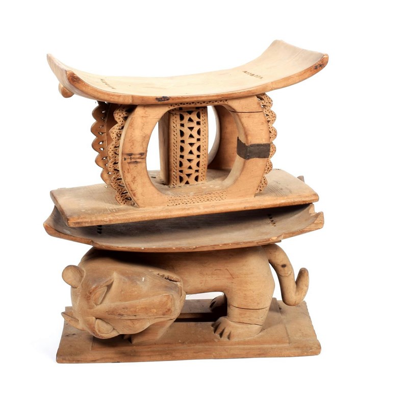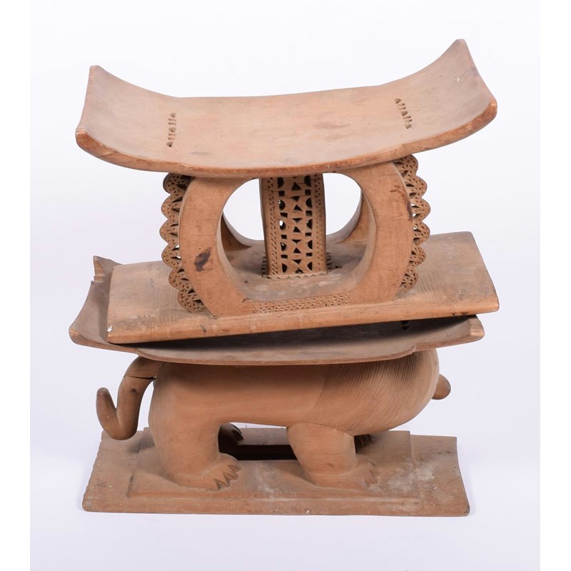An Ashanti stool, with a supporting leopard, 35.5cm high and an Ashanti stool with central pierced column, native repairs, 33.5cm high. (2)