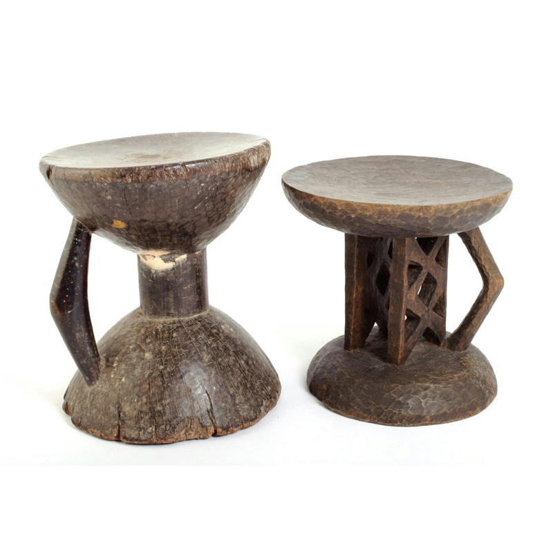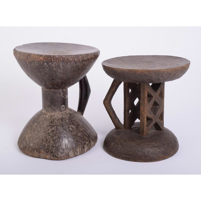 A West African stool, with a cylindrical stem and angled handle, 25.5cm high, and a Lozi stool on pierced twin supports with an angled handle, 22cm high. (2)
