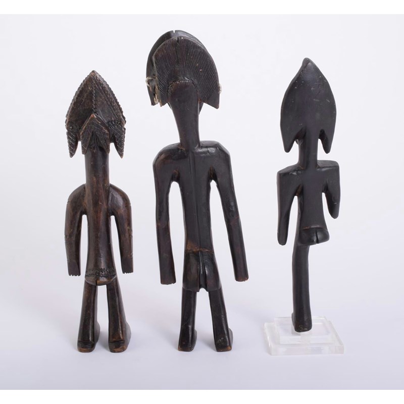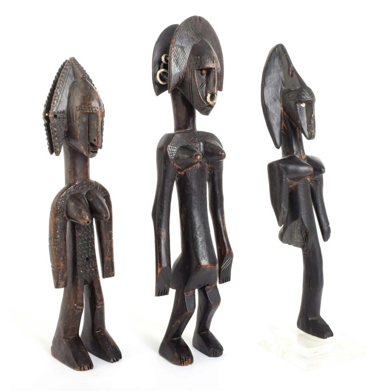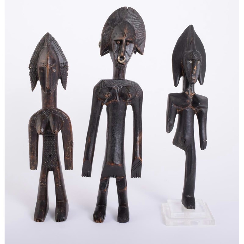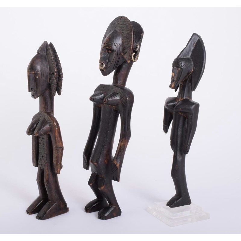 A Bambara standing female figure, with nail eyes and incised decoration, 32.6cm high, a Bambara standing female figure with earrings and nose ring and a third Bambara figure, losses. (3)