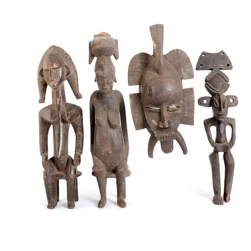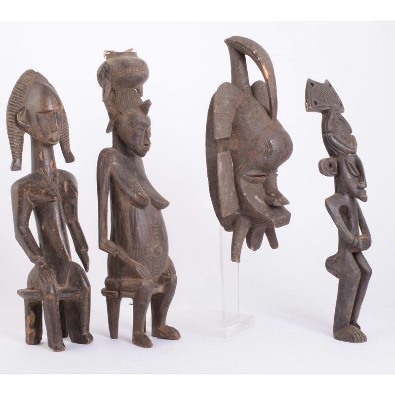 A Senufo seated female figure, 49.5cm high, a Bambara seated female figure, 46.8cm high, a Senufo mask, 37cm high and a standing figure, 44cm high. (4)