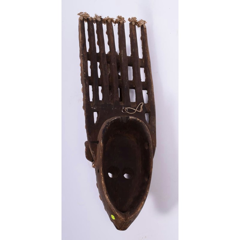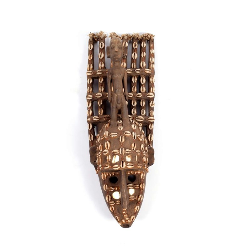 A Bambara mask, with a comb back and standing male figure surmount, with shell, seed and mirrors, 64cm high.