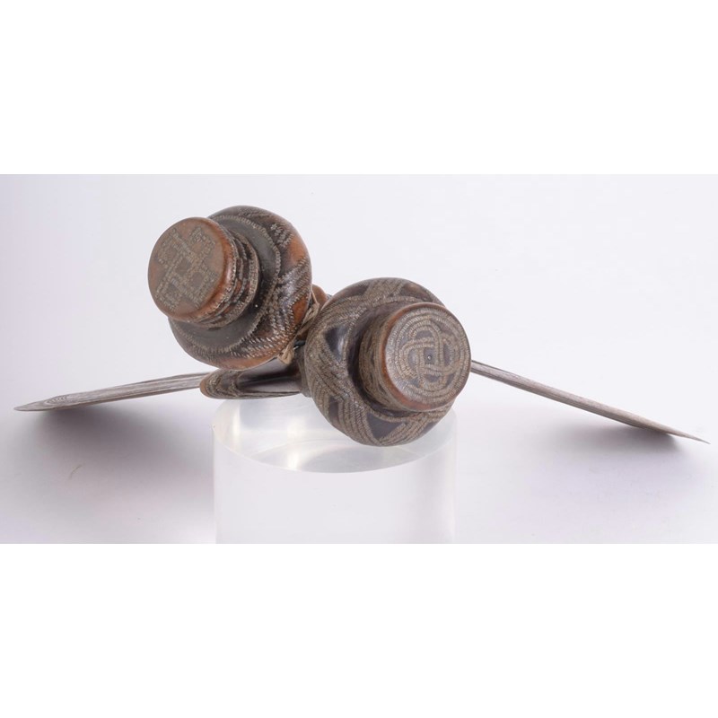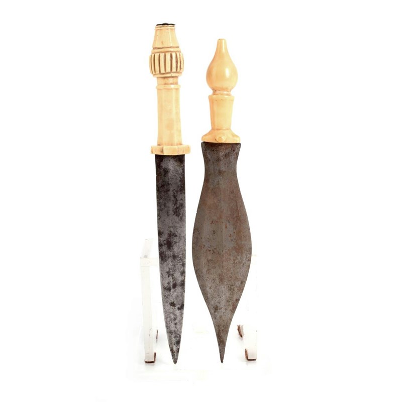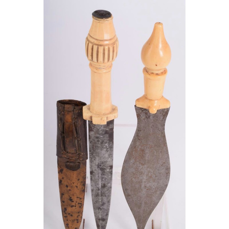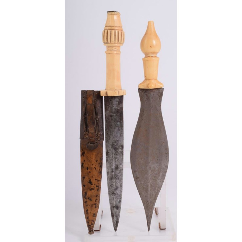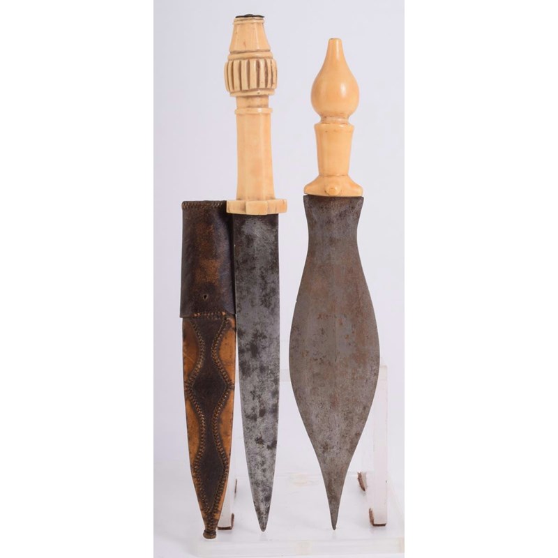 λ An African knife, with a leaf shape blade and ivory handle, 30cm long and an African knife with faceted and ribbed ivory handle, with leather scabbard, 32.5cm long. (2)