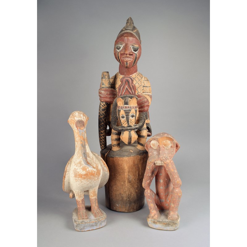 a Yoruba carved seated monkey and a bird swallowing a snake, both polychrome decorated, 28.5cm and 36cm high.