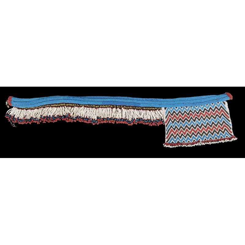 A Zulu beaded waistband South Africa with three cylindrical rows hung with a rectangular panel...