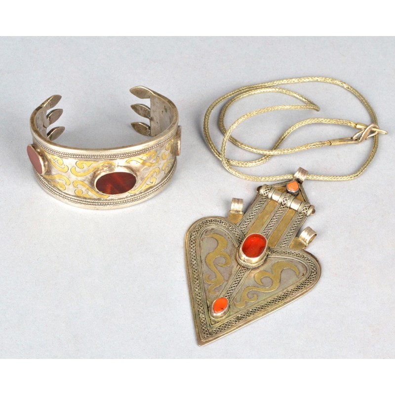 silver coloured metal, parcel gilt and mounted with three oval carnelians,