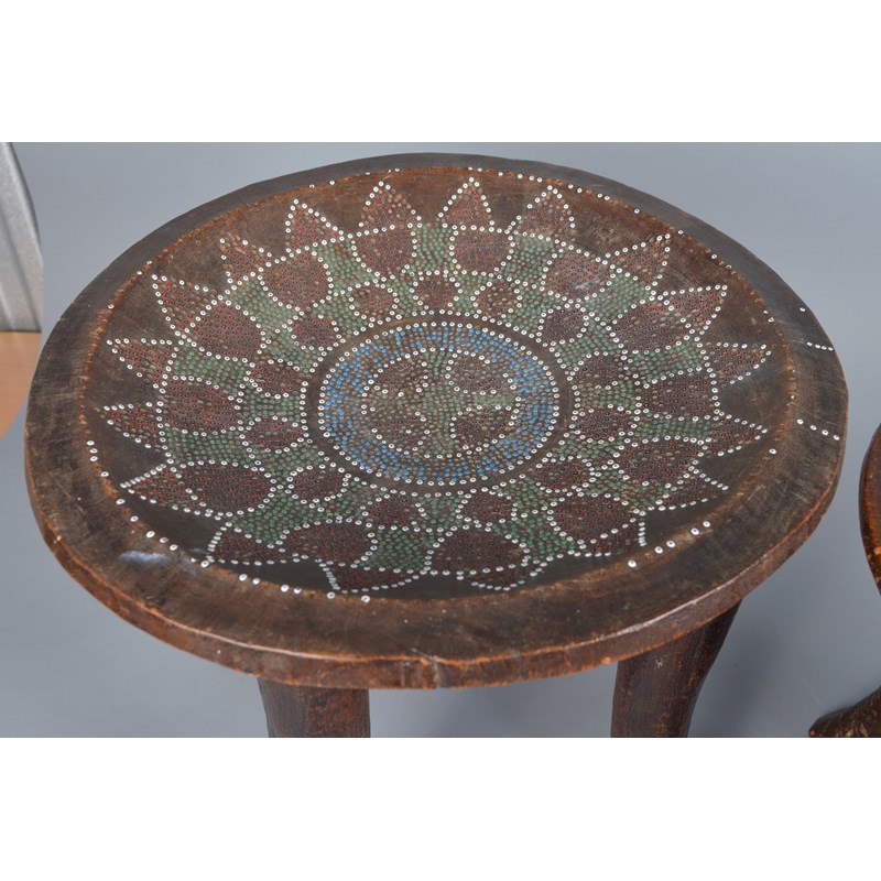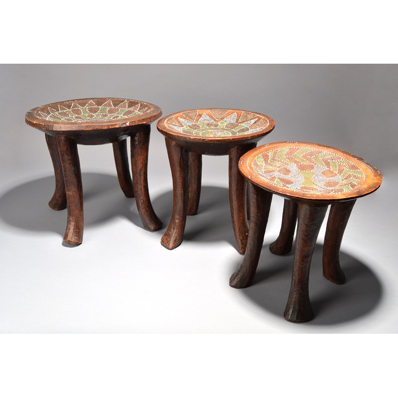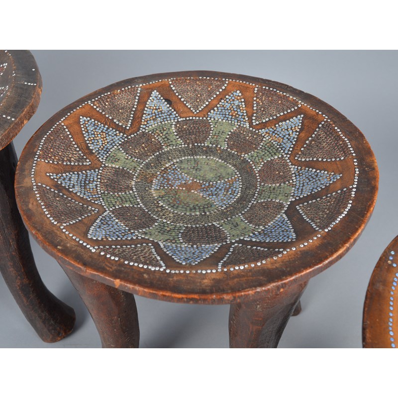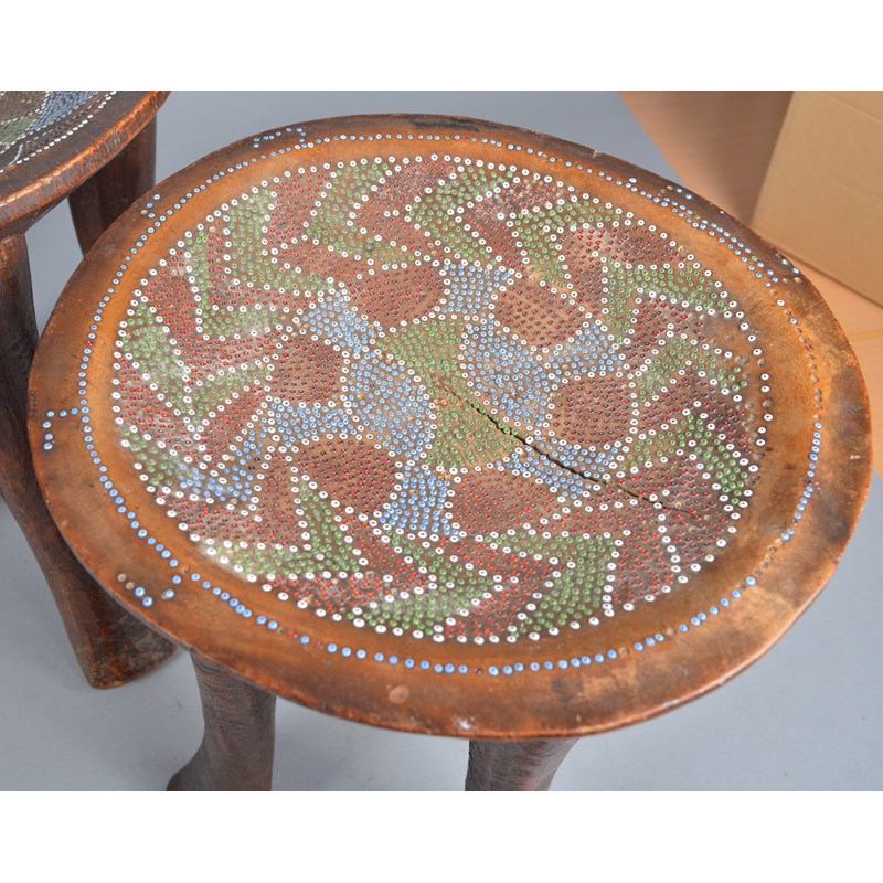 Three Kamba stools Kenya with coloured beaded dished seats and on four curved legs
