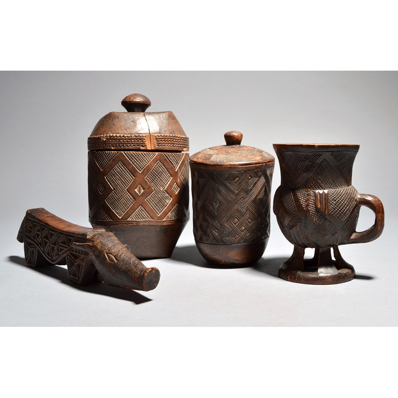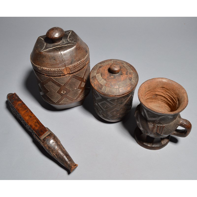 two Kuba cylindrical vessels with covers and a Kuba oracle, carved as a pig. (6)