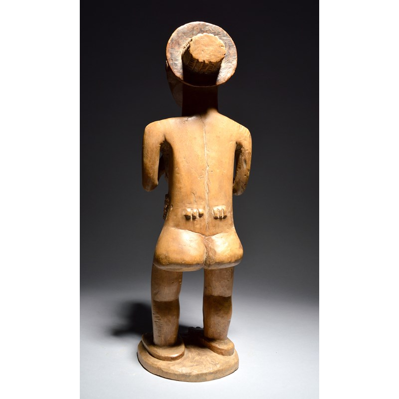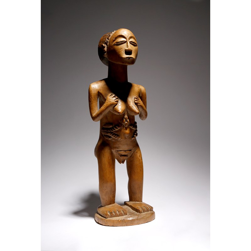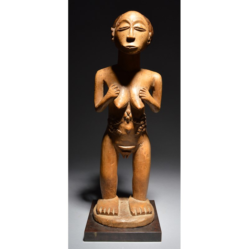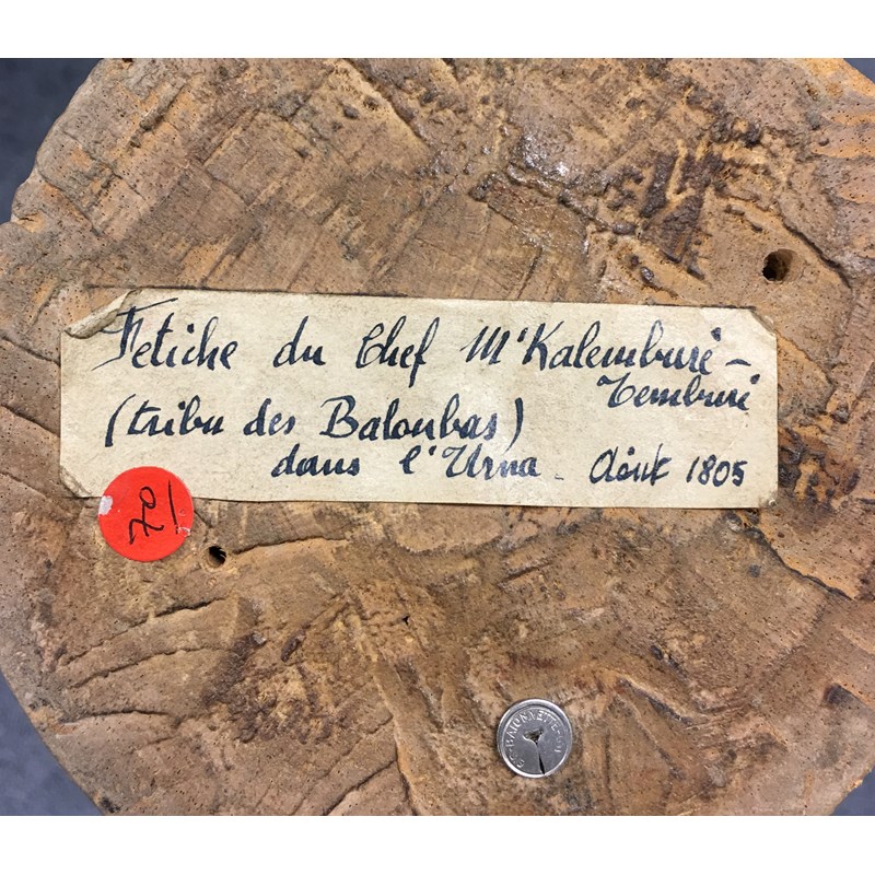 with a disc and conical coiffure with carved chevrons, the serene face with coffee bean eyes and pursed lips, with her hands placed on her breasts and with raised scarifications around her naval and lower back, the base with a paper label inscribed Fetiche du Chef M'Kalembure - Temburi (tribu des Baloubas) dans l'Urua _ Aout 1805,