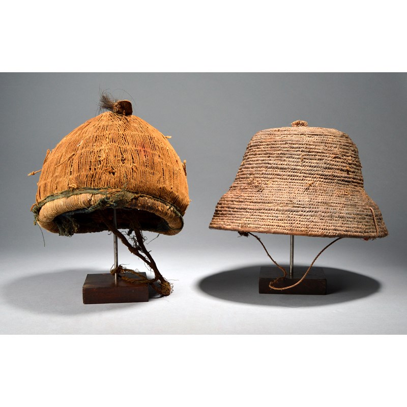plant fibre, one with a raised circular finial, the other with applied animal fur and with a cloth band,