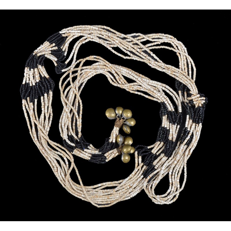 shell beads, black glass beads, strung and with brass bells to the ends,