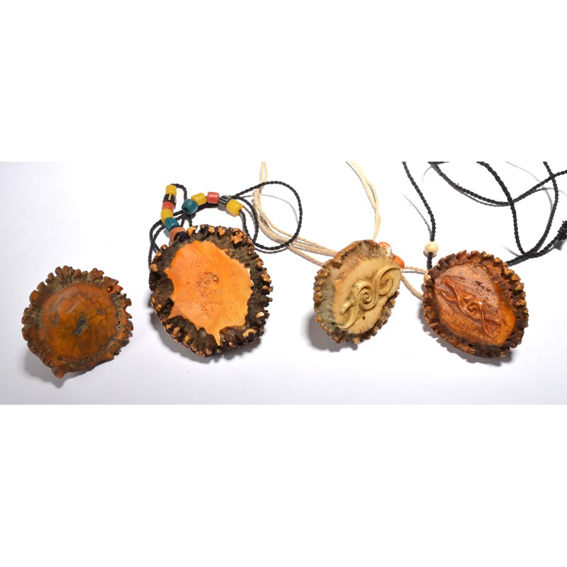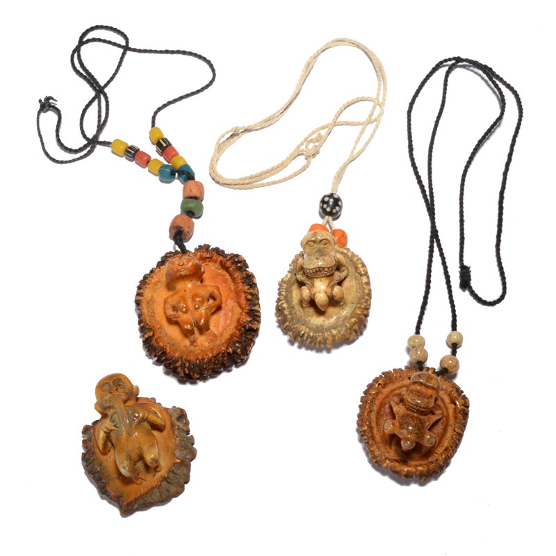 antler, with carved ancestor figures and a female figure, three with beaded fibre loops,