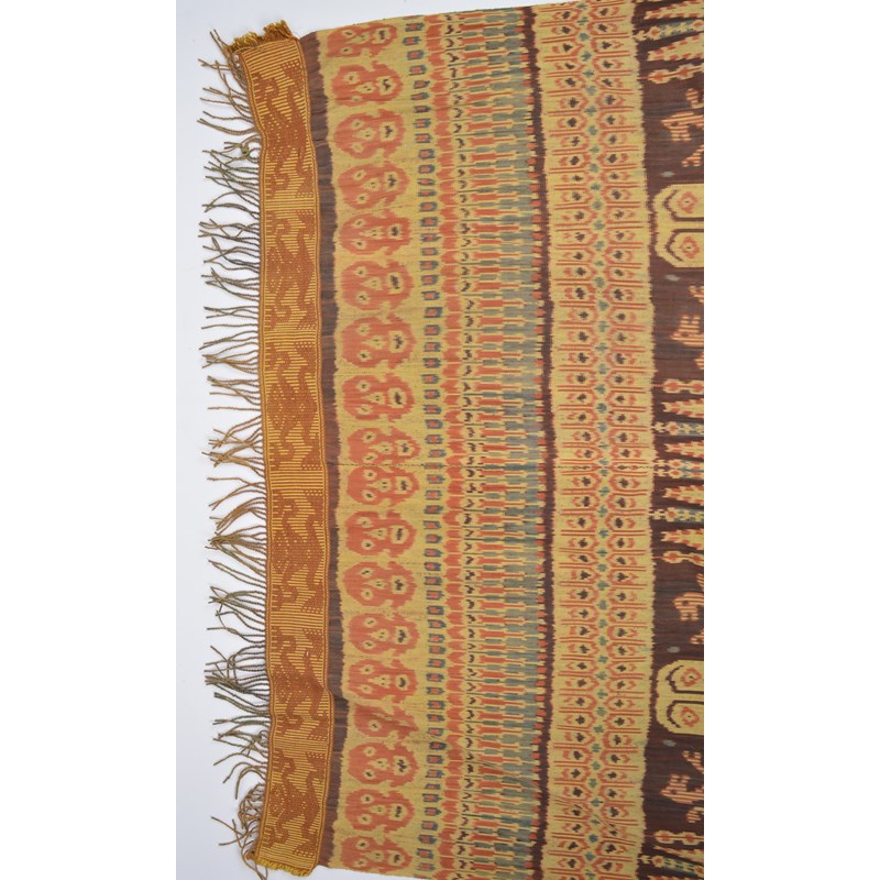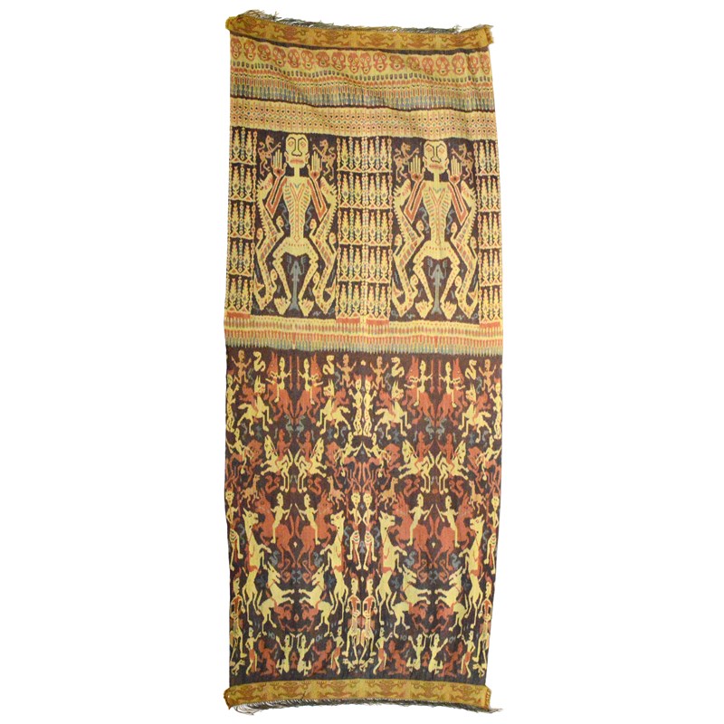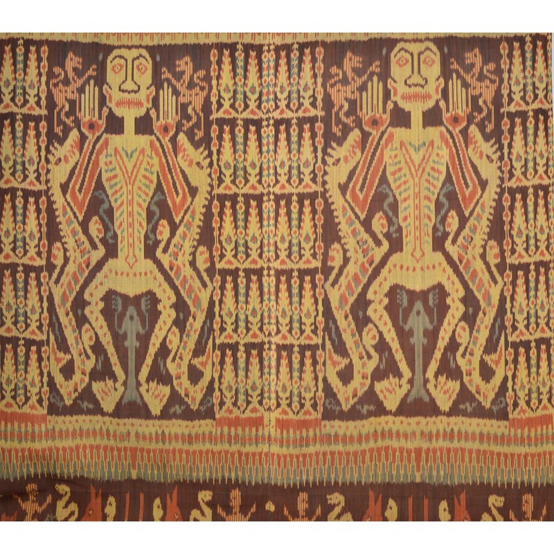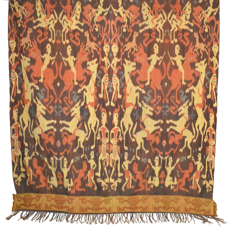decorated masks, ancestor figure and beasts, with a battle scene with mounted tribesmen, animals and other figures,