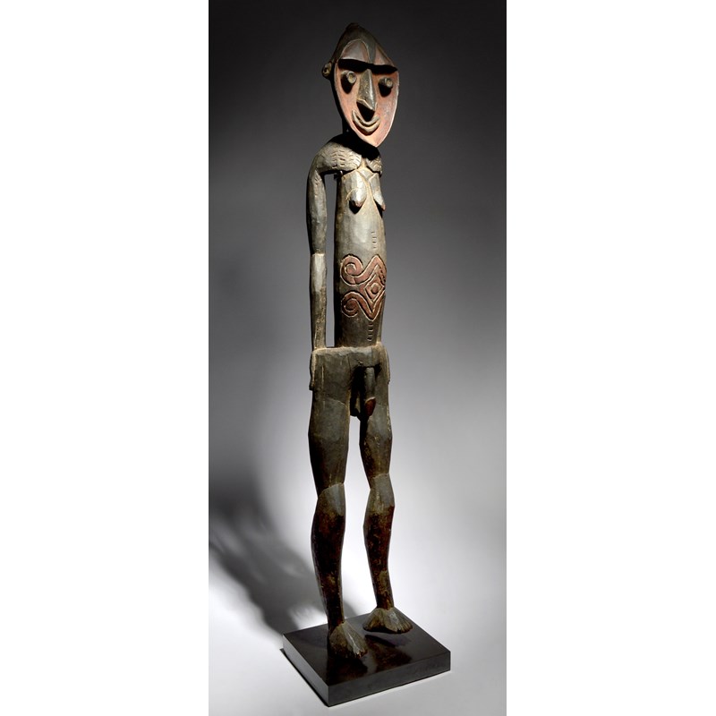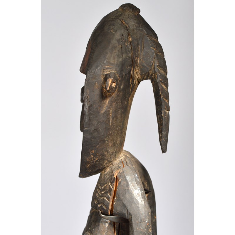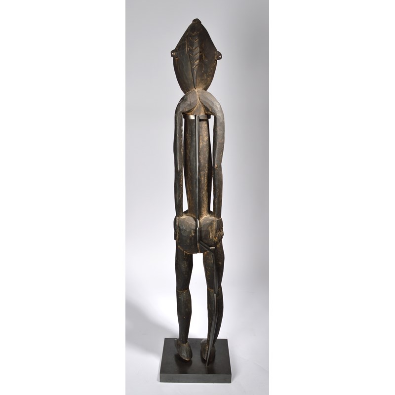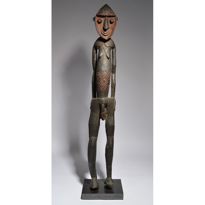 with a pony tail, pierced ears and body scarifications, with black and red pigment,